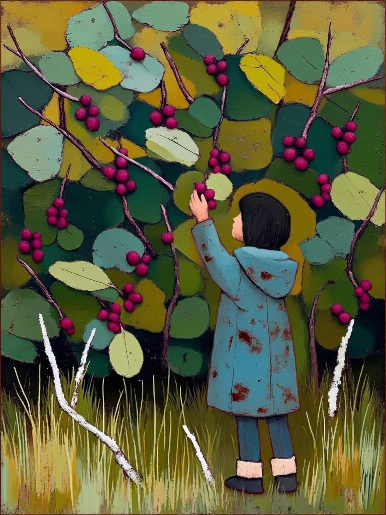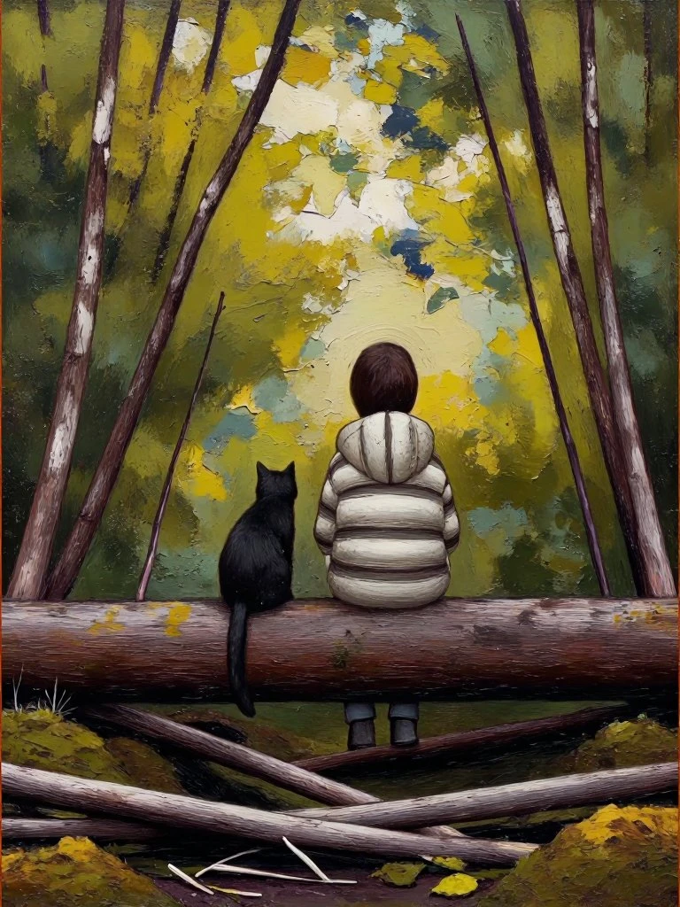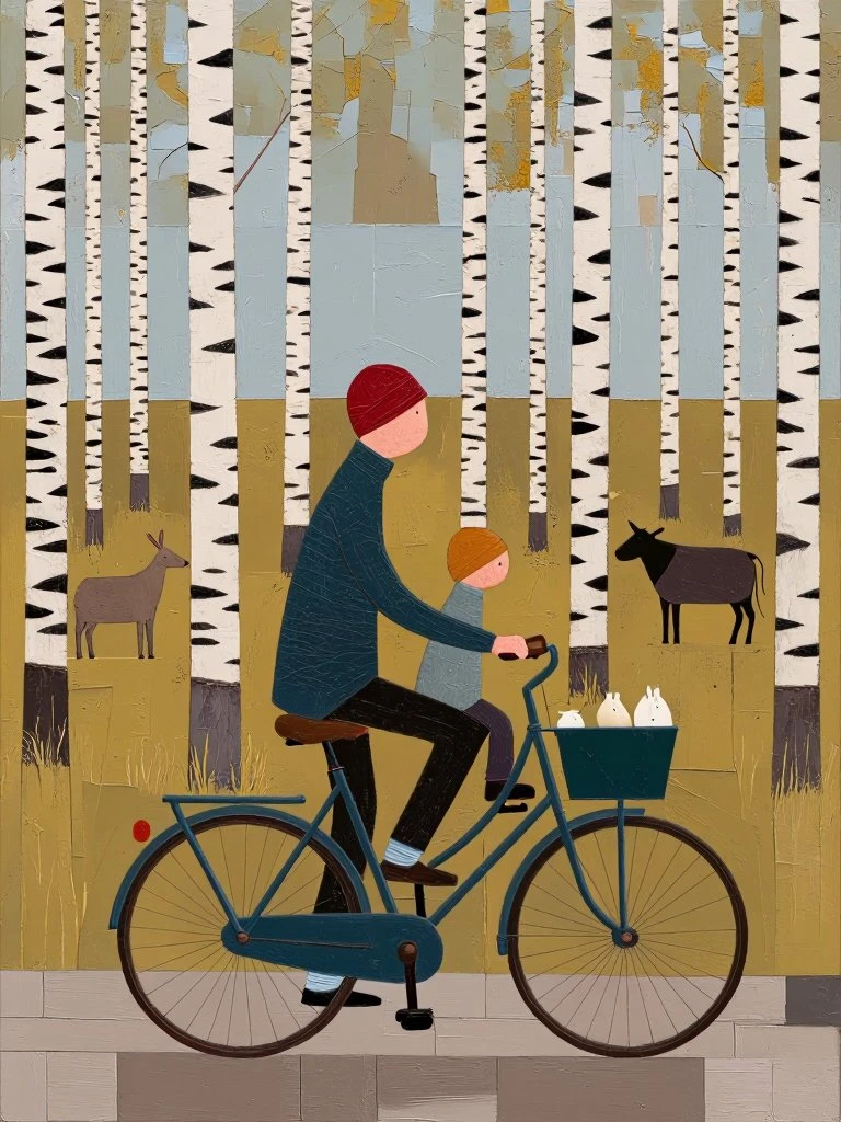 bicycle scene with adult, child, and animals in birch forest, mosaic‑like textured background, abstract expressionist color blocks, layered acrylic and oil, whimsical proportions, tactile surface depth