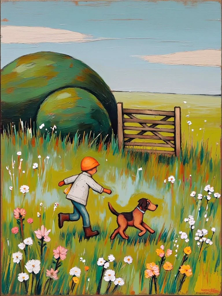 figure walking dogs with red balloons along waterfront, windswept abstract landscape, thick layered oils, textured ground, expressive color blocking, whimsical proportions, grainy brushwork and softened edges
