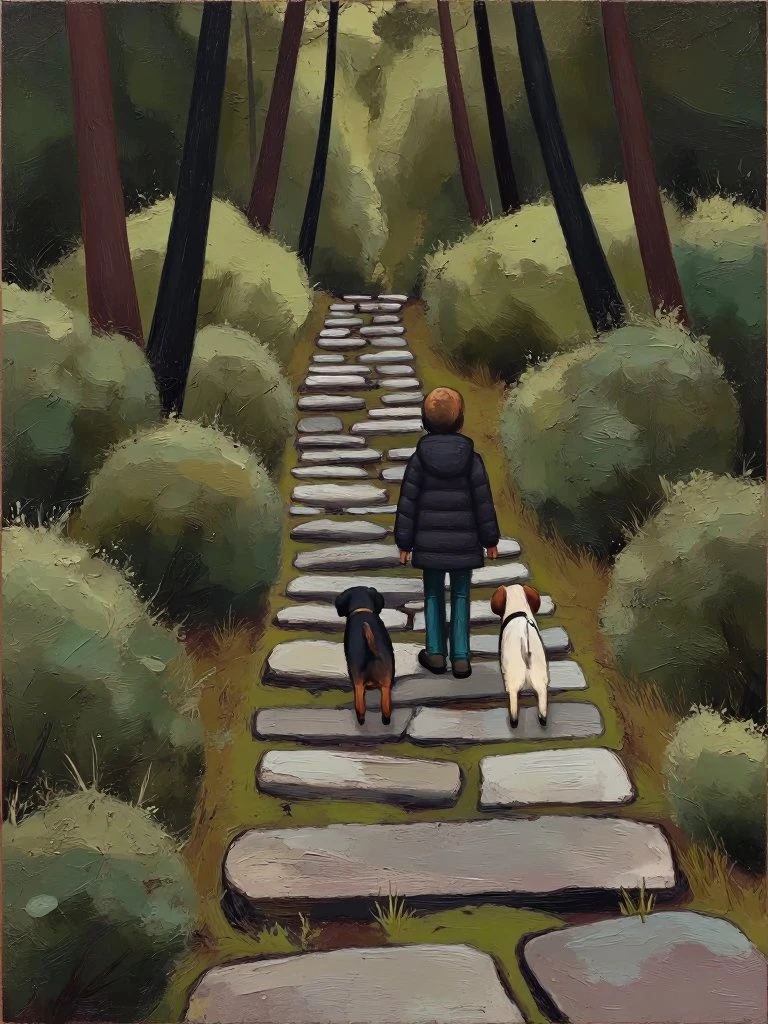 figure walking with small white dog along winding path, divided landscape of yellow and green fields, muted impasto textures, atmospheric abstraction, layered oils with soft blending, contemplative mood