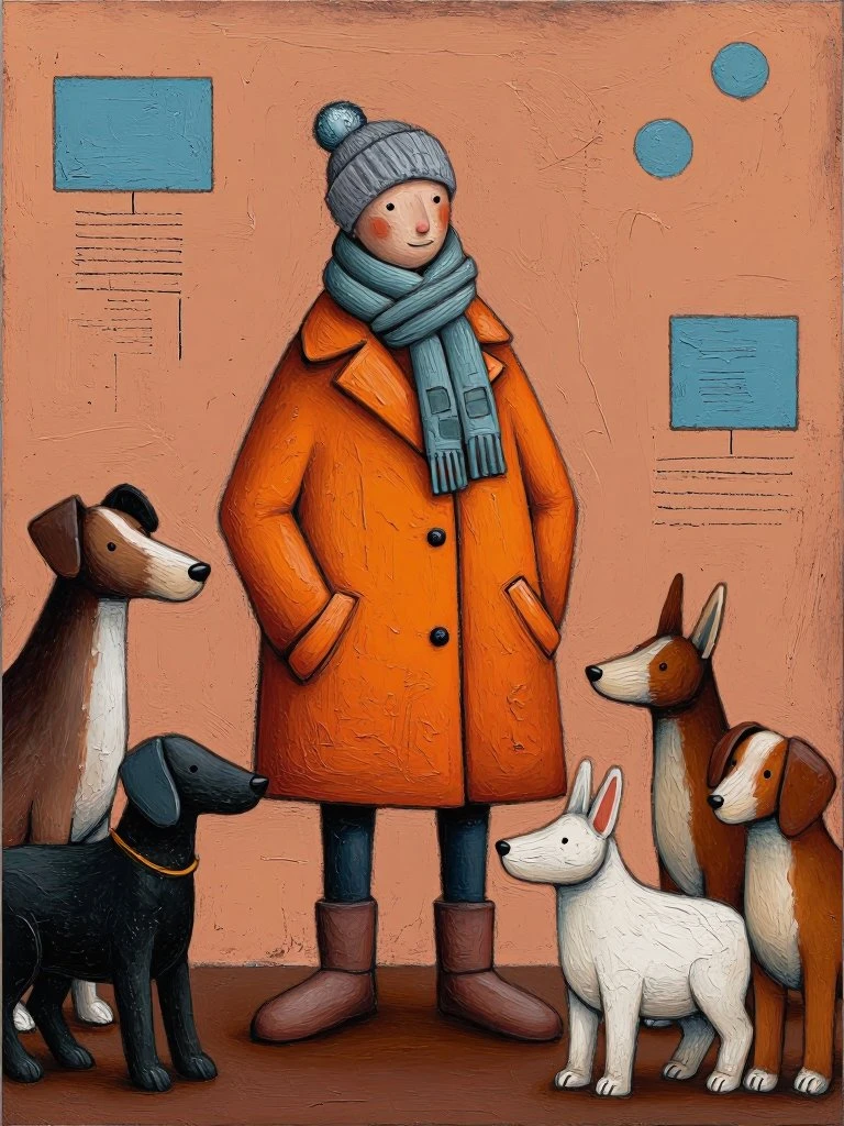whimsical figure in an orange coat surrounded by animals, thick impasto textures, abstract expressionist brushwork, layered acrylic and oil blend, warm ochres and muted blues, hand‑scratched surface marks, playful surreal composition with rough tactile strokes