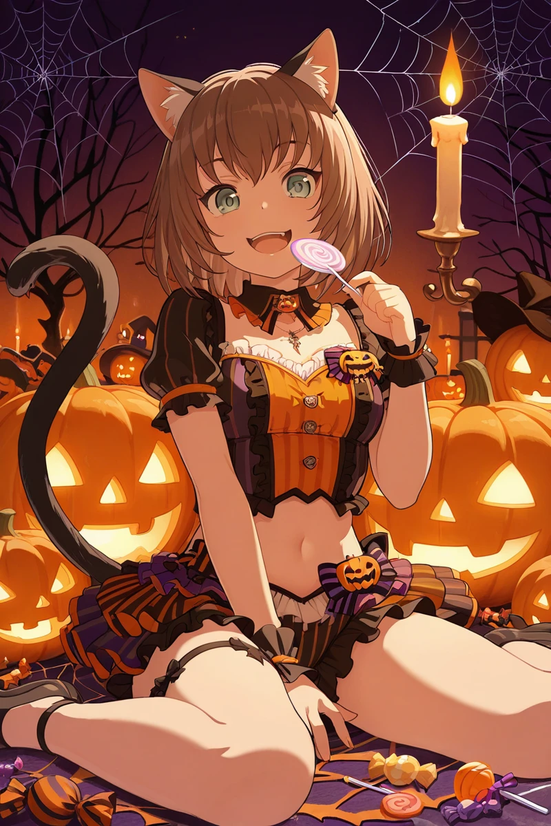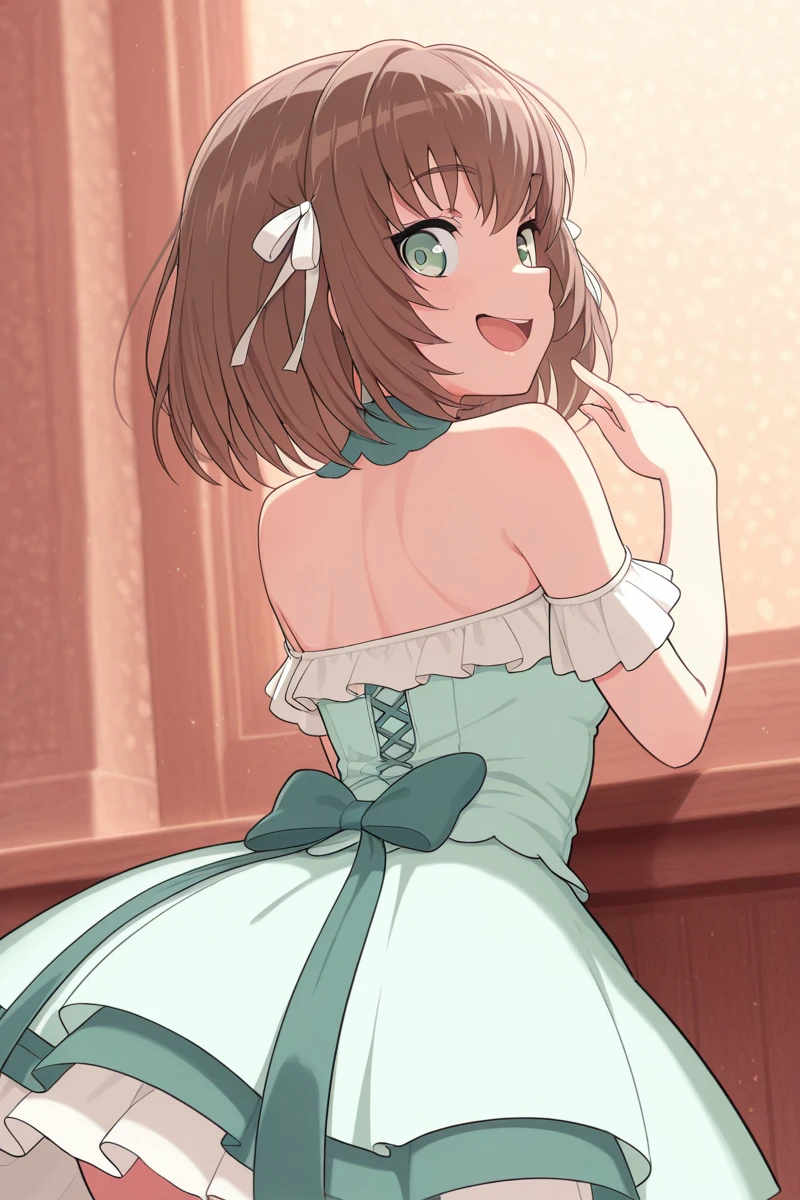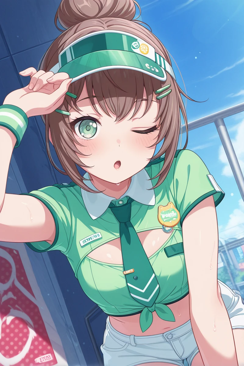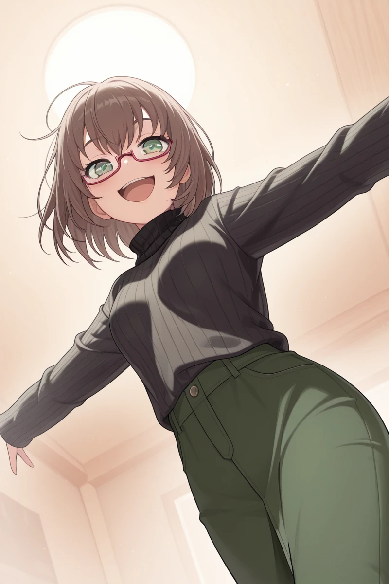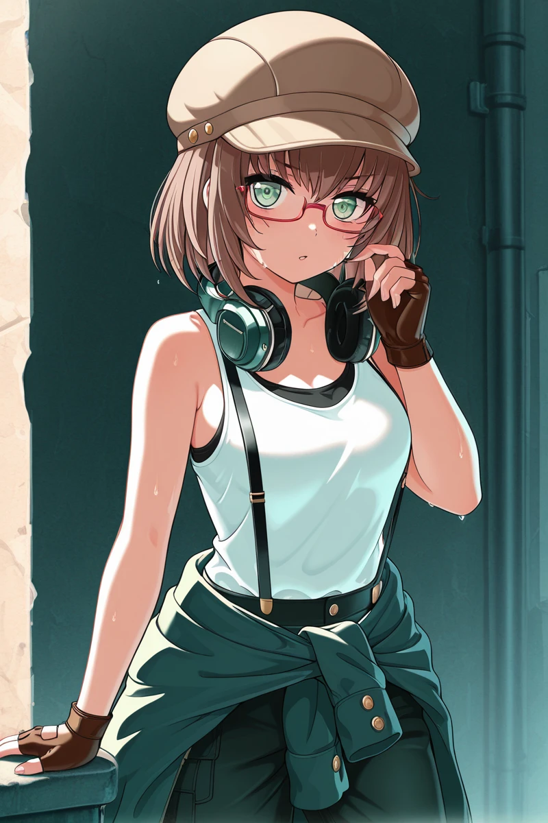 yamatomaya, 1girl, solo, gloves, headphones, glasses, hat, fingerless gloves, headphones around neck, clothes around waist, suspenders, brown hair, cabbie hat, looking at viewer, brown gloves, red-framed eyewear, jacket, semi-rimless eyewear, green eyes, white shirt, shirt, jacket around waist, under-rim eyewear, pants, cslskSchool uniform Maya: