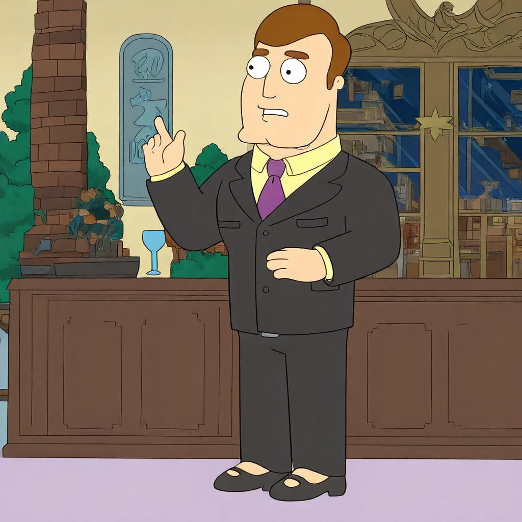 Greg, 1man, male, mature male, brown hair, brown eyebrows, black eyes, round ears, black suit, yellow collared shirt, purple necktie, black dress pants, black dress shoes,
