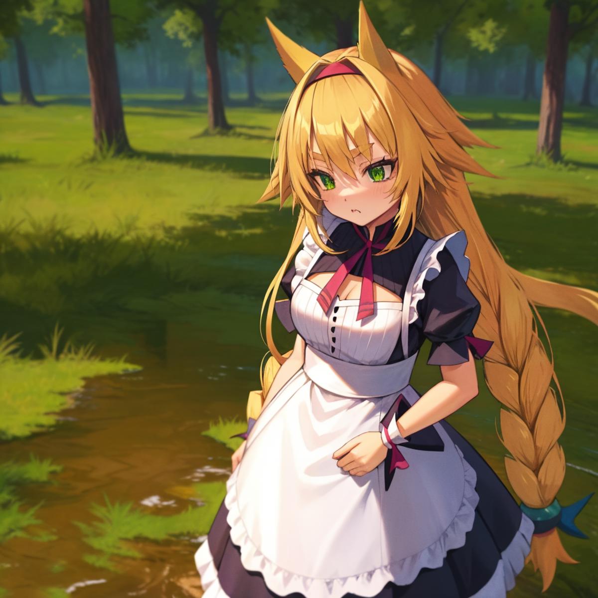 The tags are: metallia, animal ears, twin braids, long hair, blonde hair, green eyes, hat, witch hat,sharp teeth.