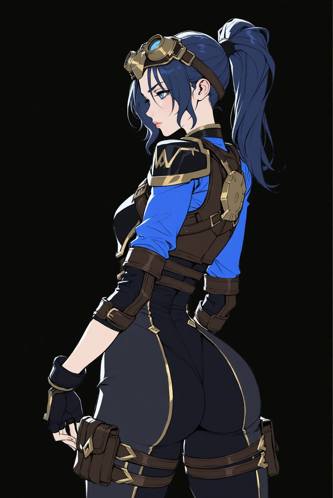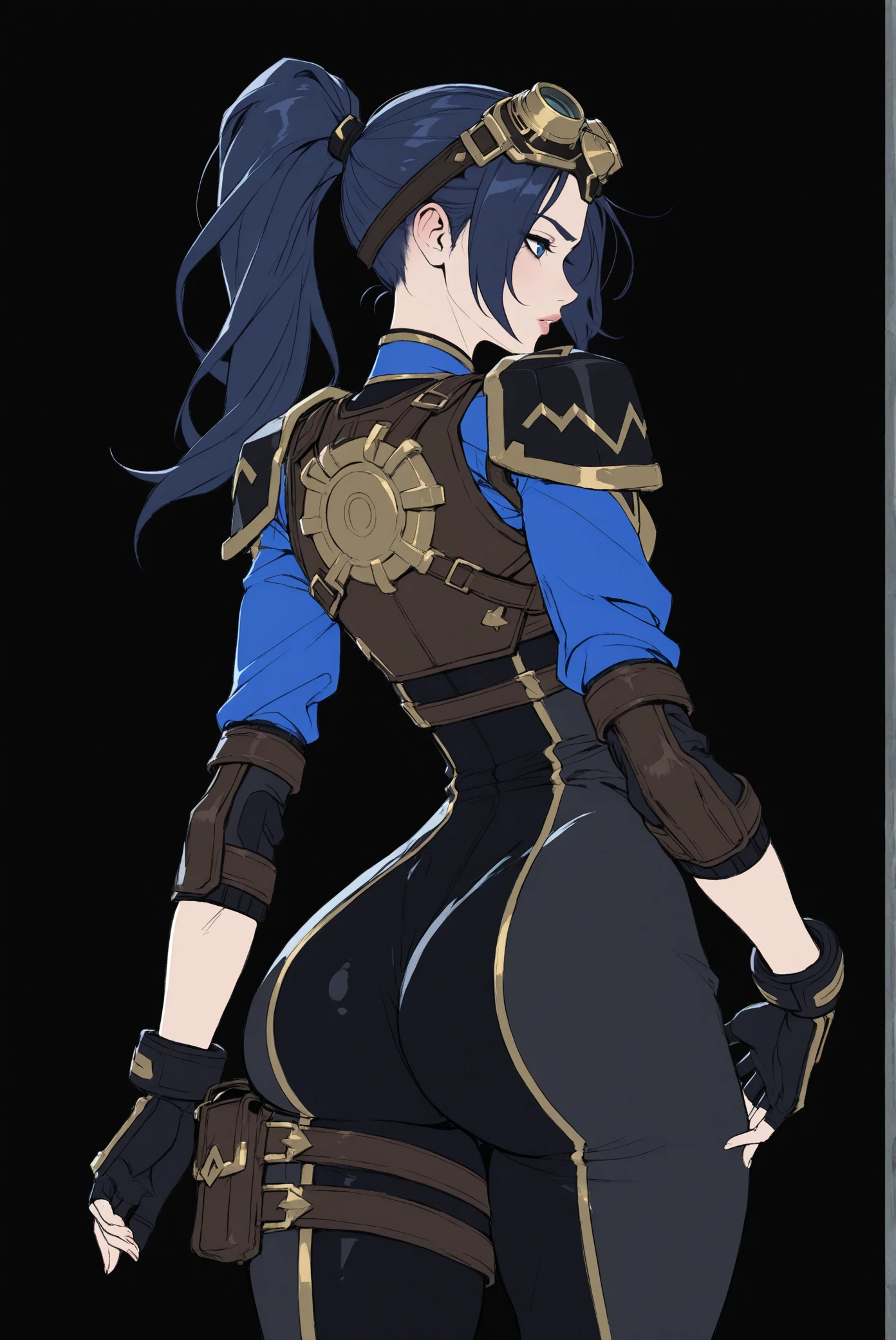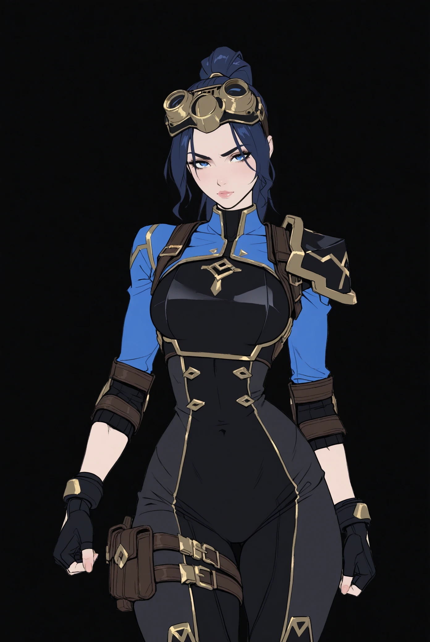 2xko_Cait_Arcane, dark blue hair, blue eyes, ponytail, side bangs, athletic build, black outfit , gold accents, armored vest, fingerless gloves, utility belt,goggles headwear, high boots, heels