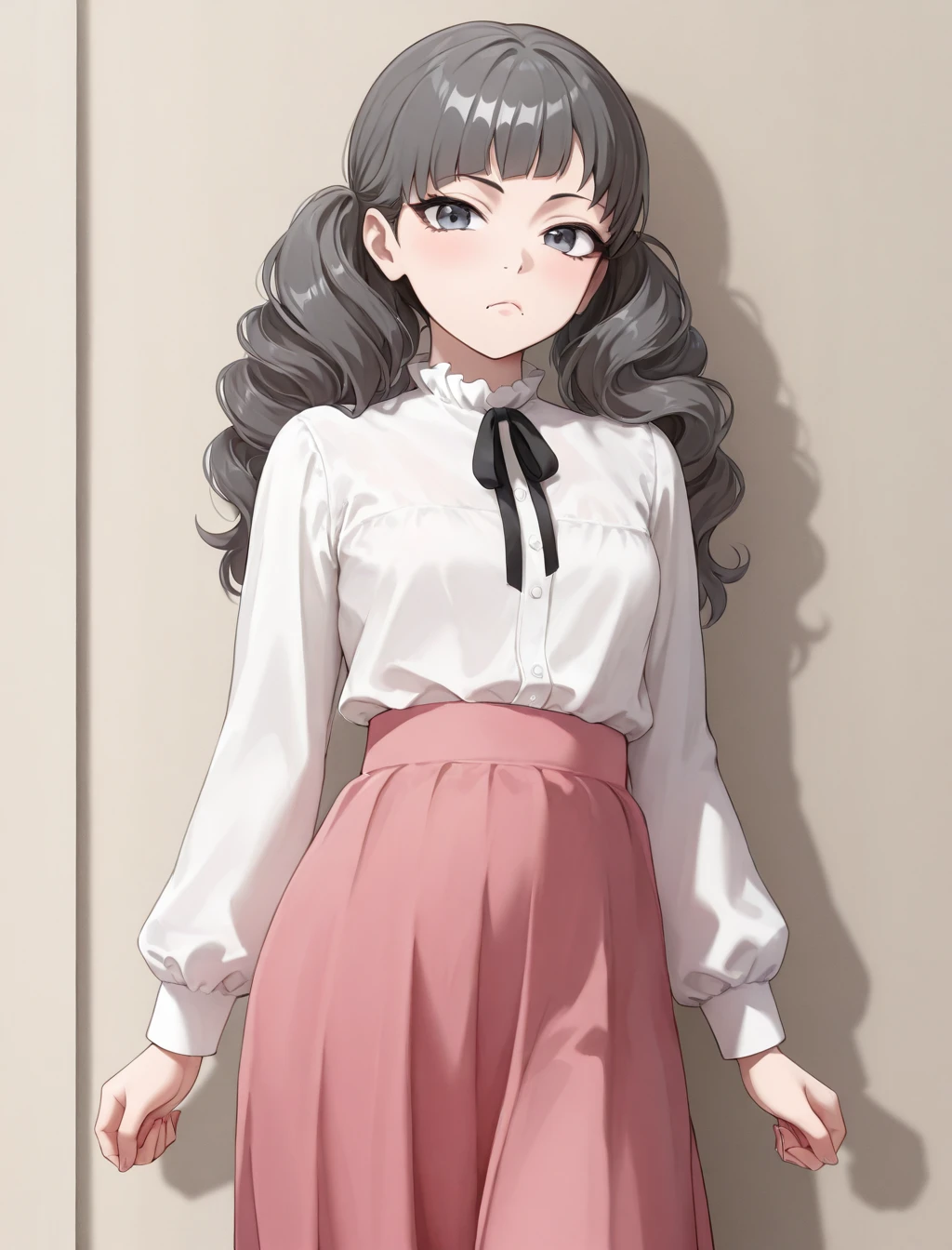 white shirt, neckbow, pink skirt