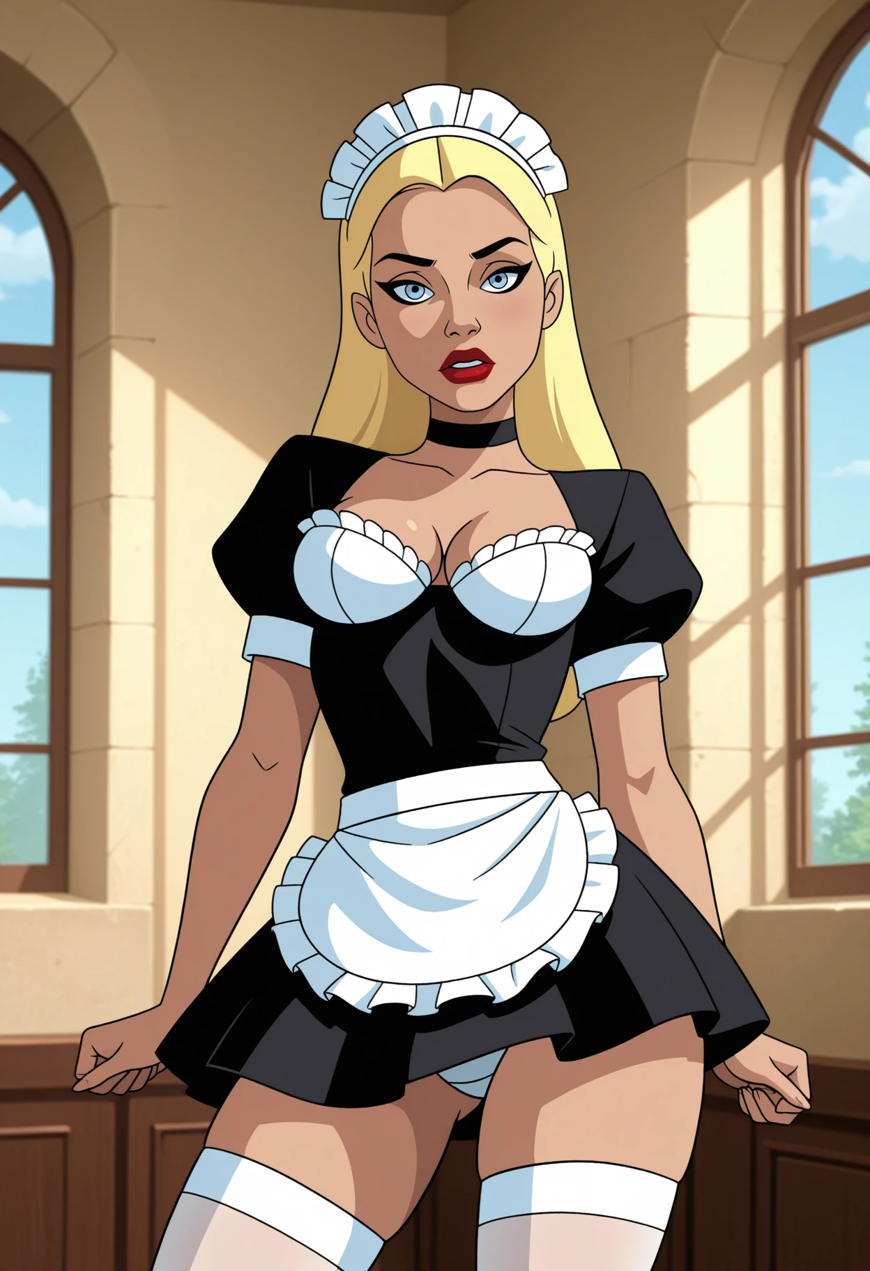 1girl, solo, blue eyes, blonde hair, long hair, breasts, medium breasts, lipstick, red lips,You can support my work by following the link: https://boosty.to/nmackelie