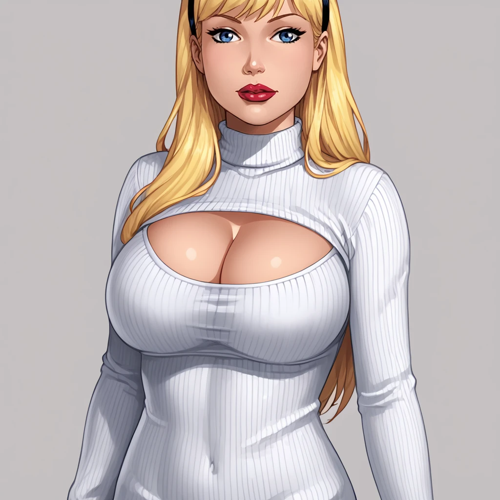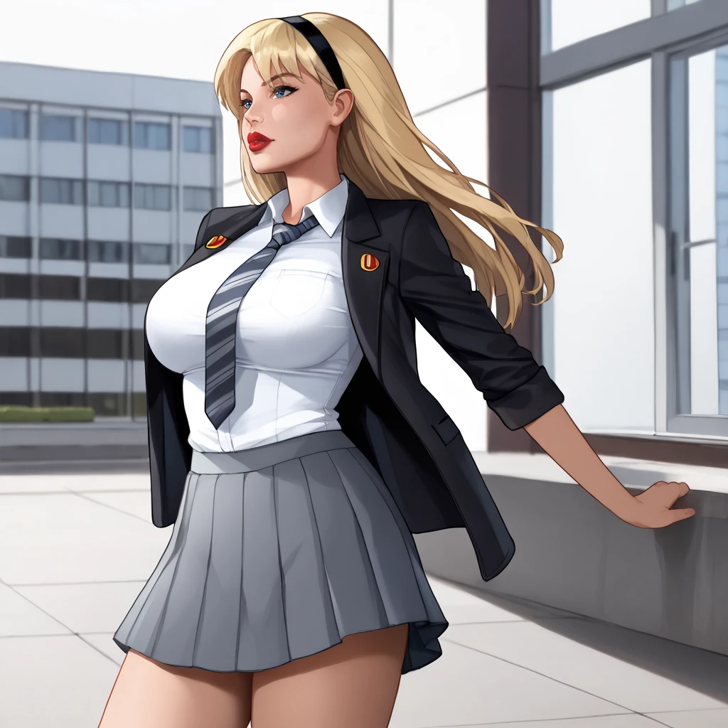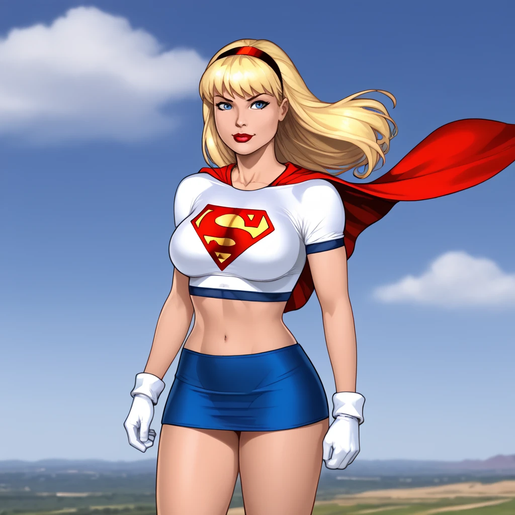 Trigger : SupergirlWhite, 1girl, solo, midriff, blonde hair, crop top, white gloves, cropped shirt, skirt, blue eyes, navel, cape, miniskirt, long hair, large breasts, lips, hairband, cowboy shot