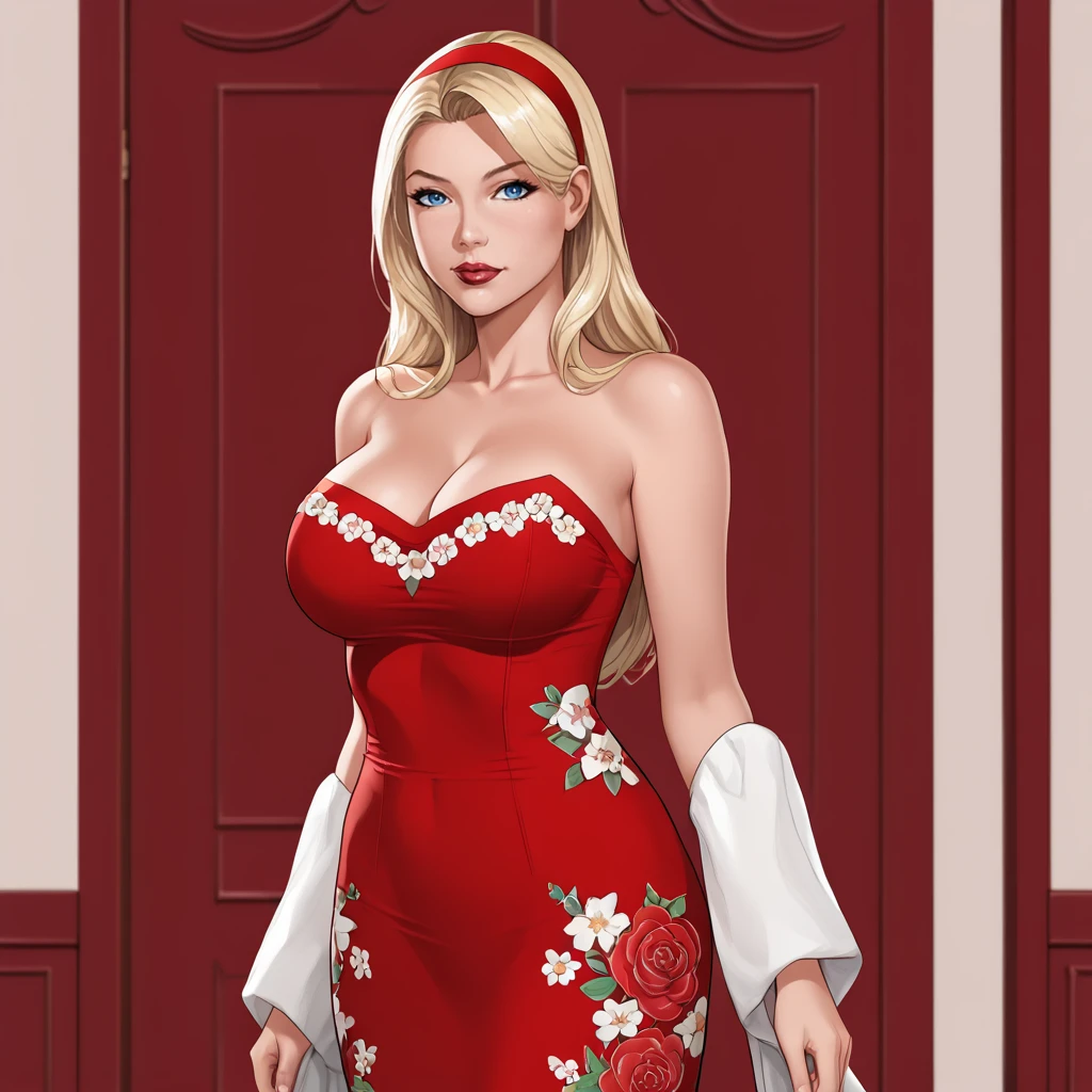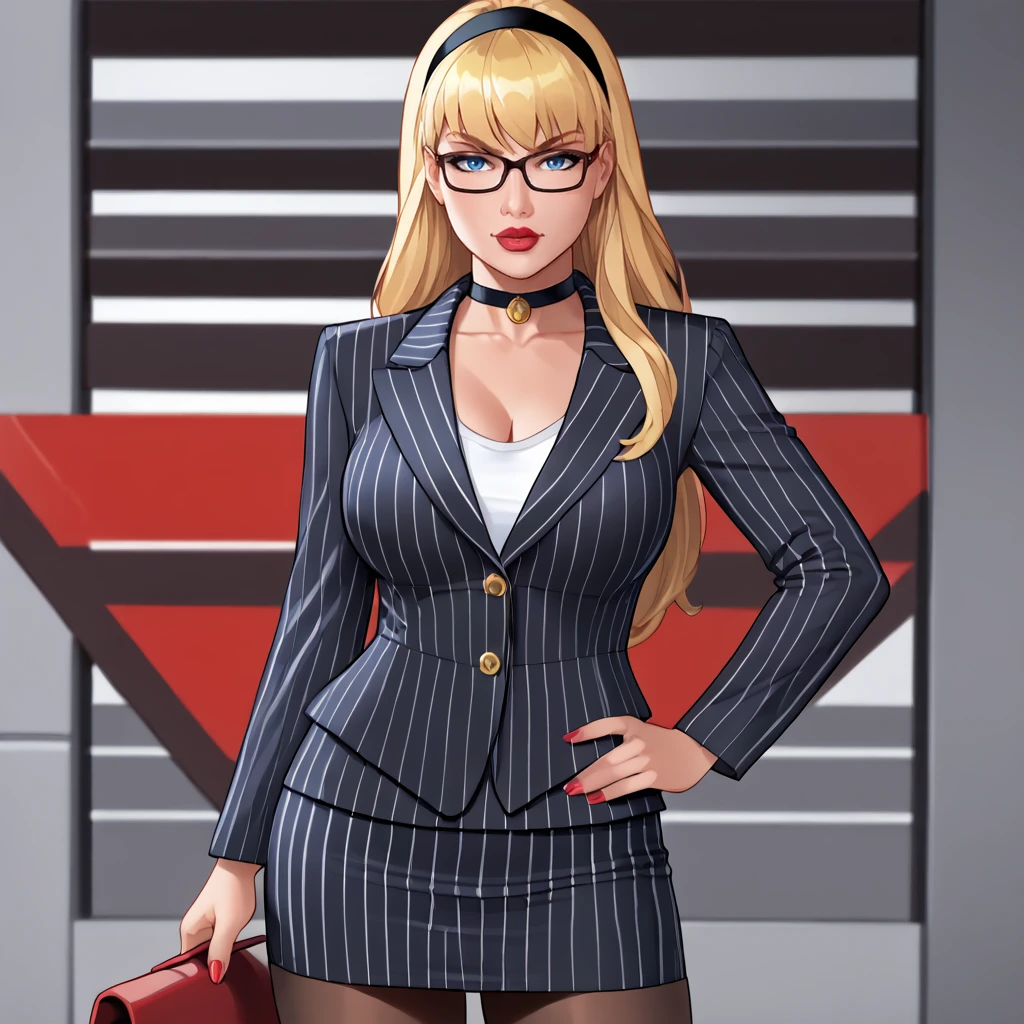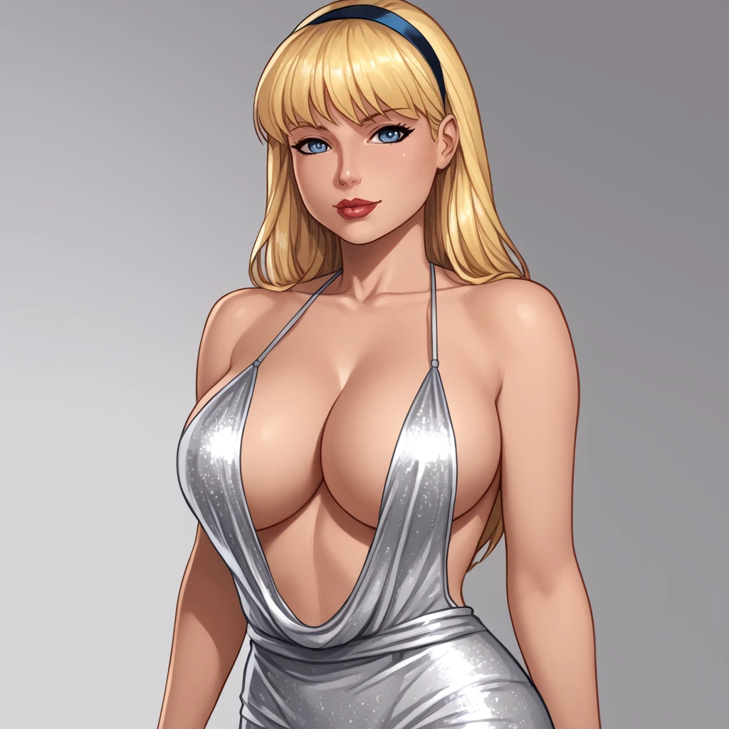 Trigger : SupergirlWhite, 1girl, solo, midriff, blonde hair, crop top, white gloves, cropped shirt, skirt, blue eyes, navel, cape, miniskirt, long hair, large breasts, lips, hairband, cowboy shot