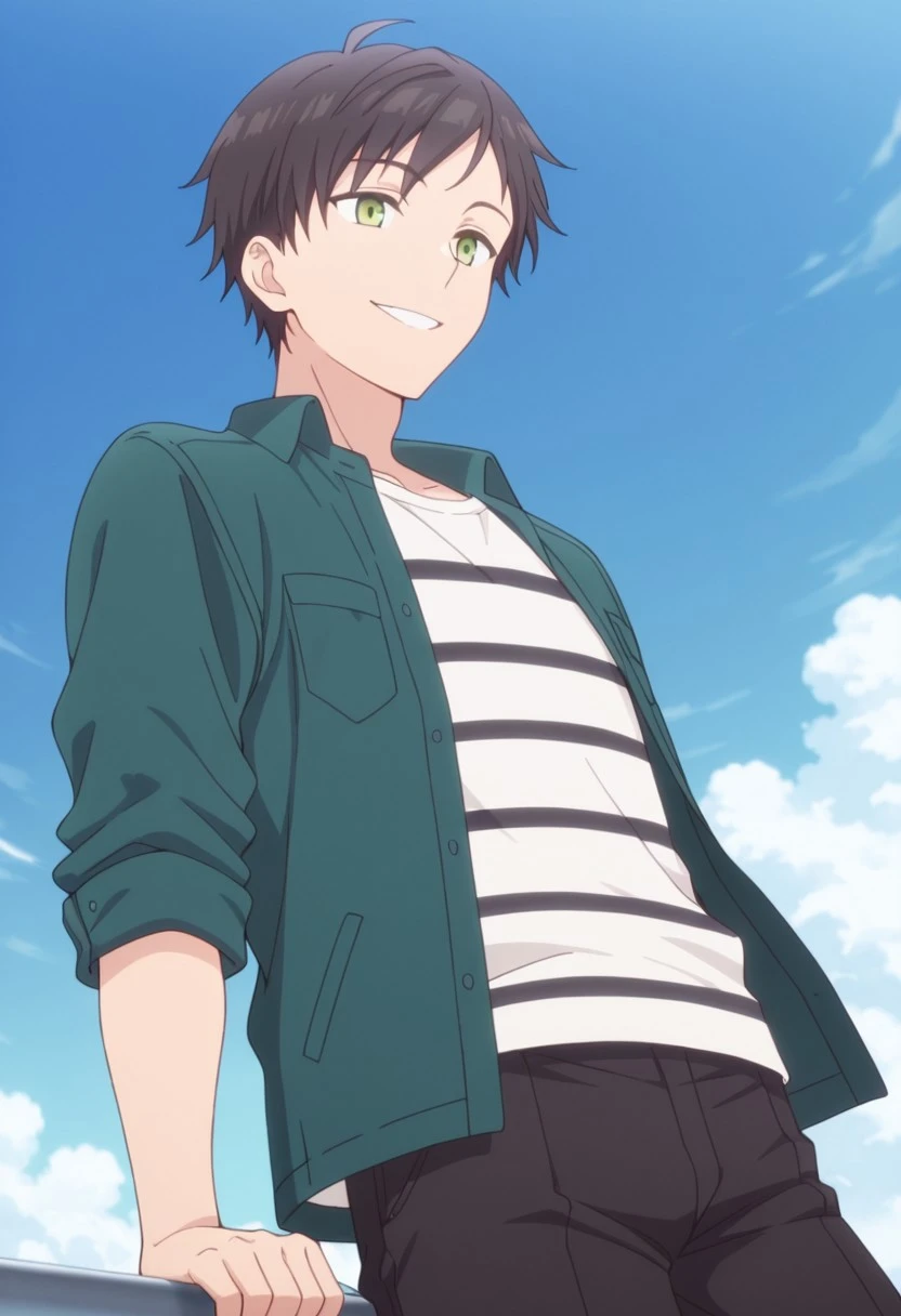 1boy, male focus, solo, green eyes, black hair, white shirt, striped shirt, green jacket, open jacket, sleeves rolled up, black pants,