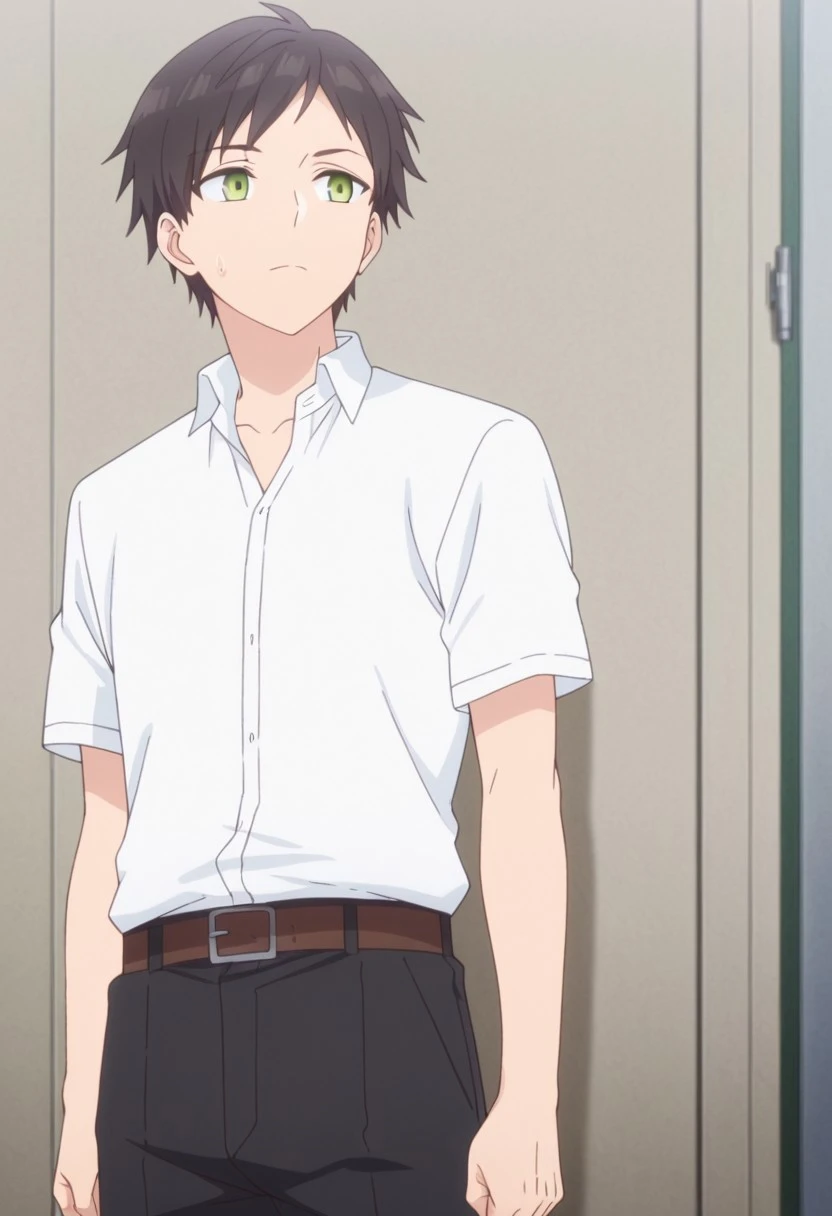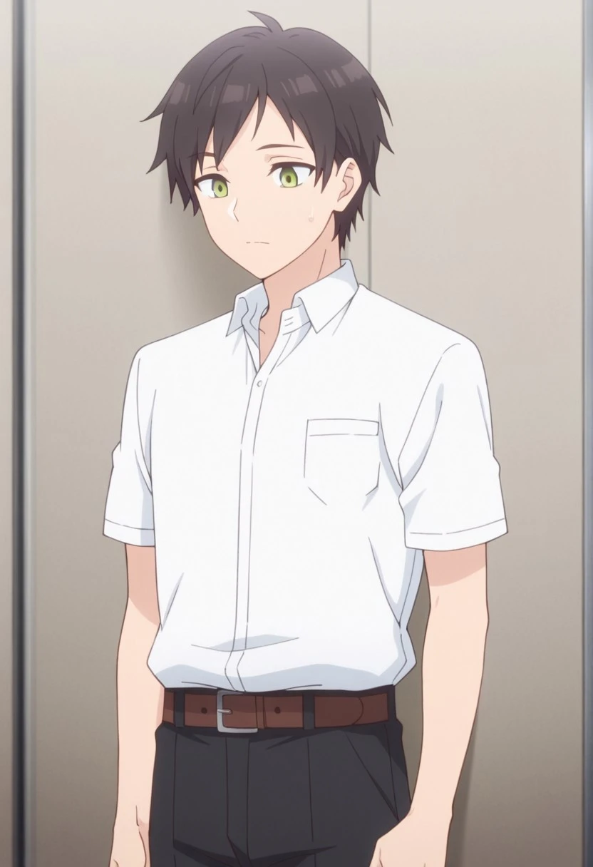 1boy, male focus, solo, green eyes, black hair, school uniform, white shirt, collared shirt, short sleeves, shirt tucked in, belt, black pants,