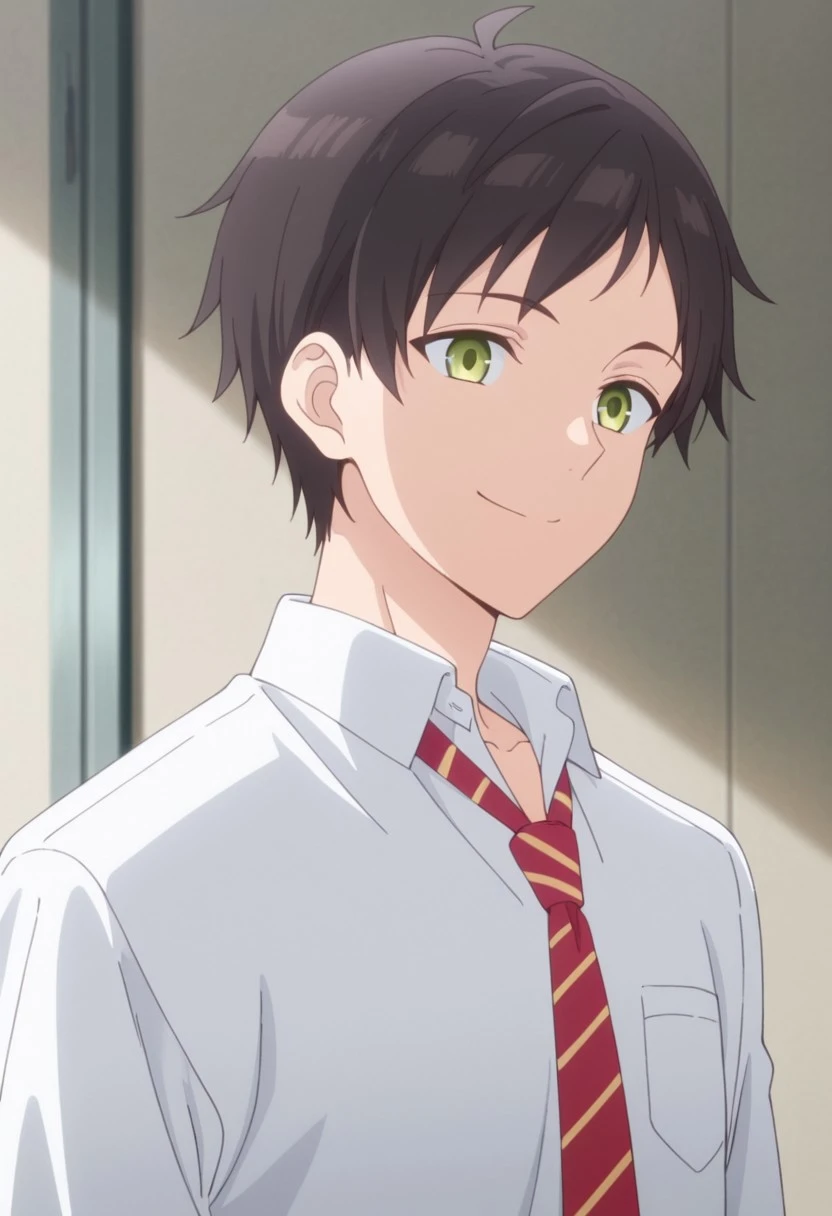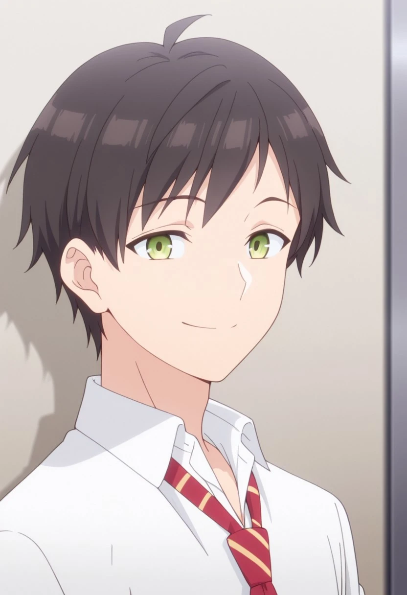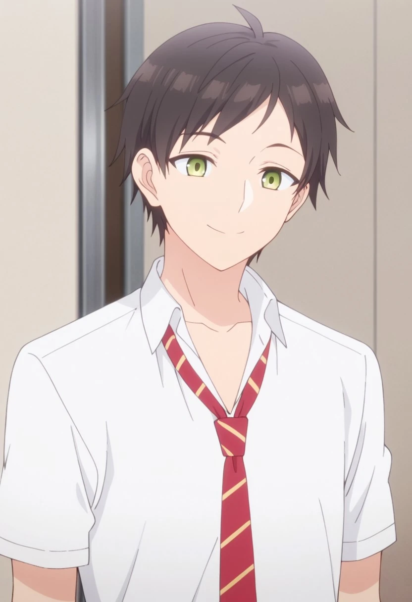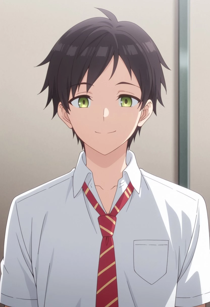 1boy, male focus, solo, green eyes, black hair, school uniform, white shirt, collared shirt, red necktie, striped necktie, short sleeves, black pants,
