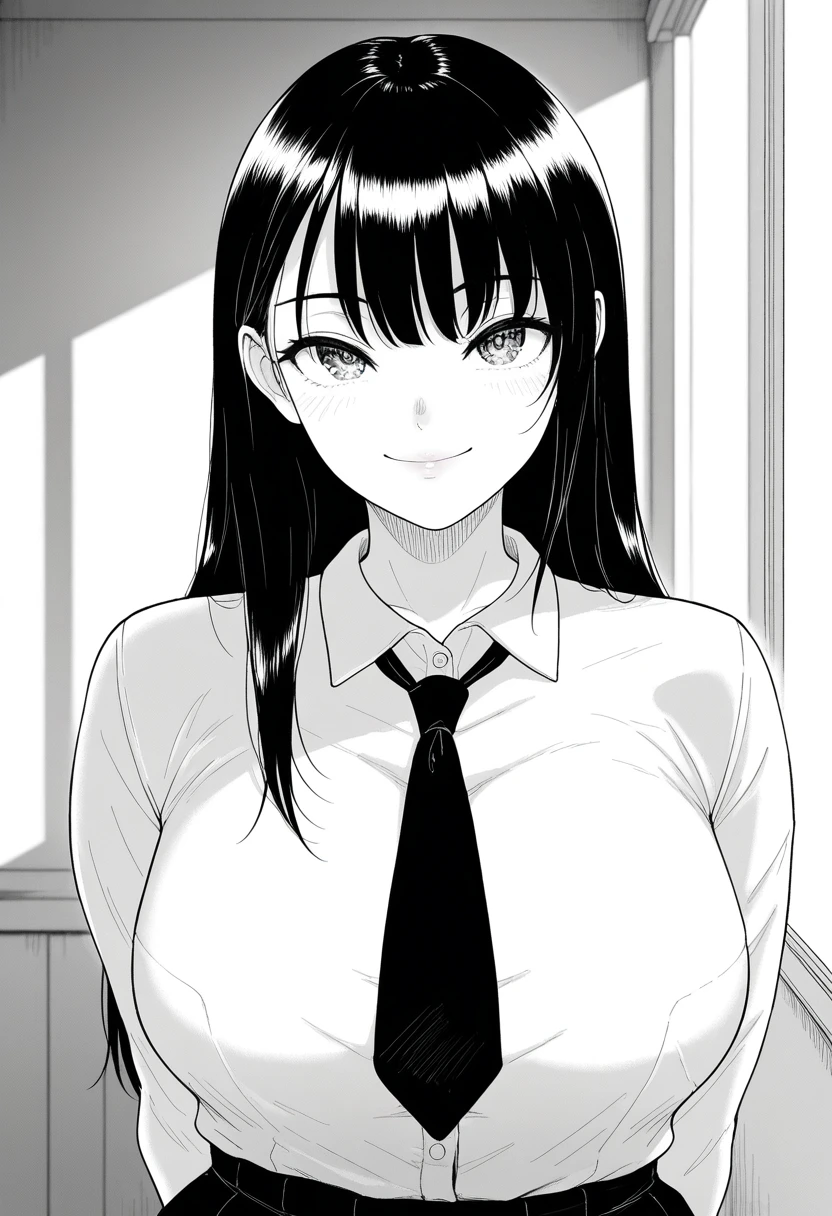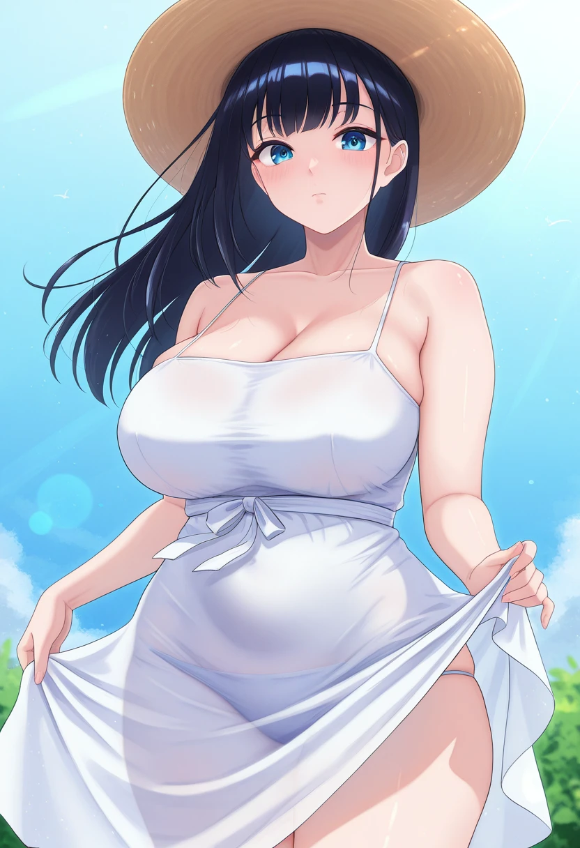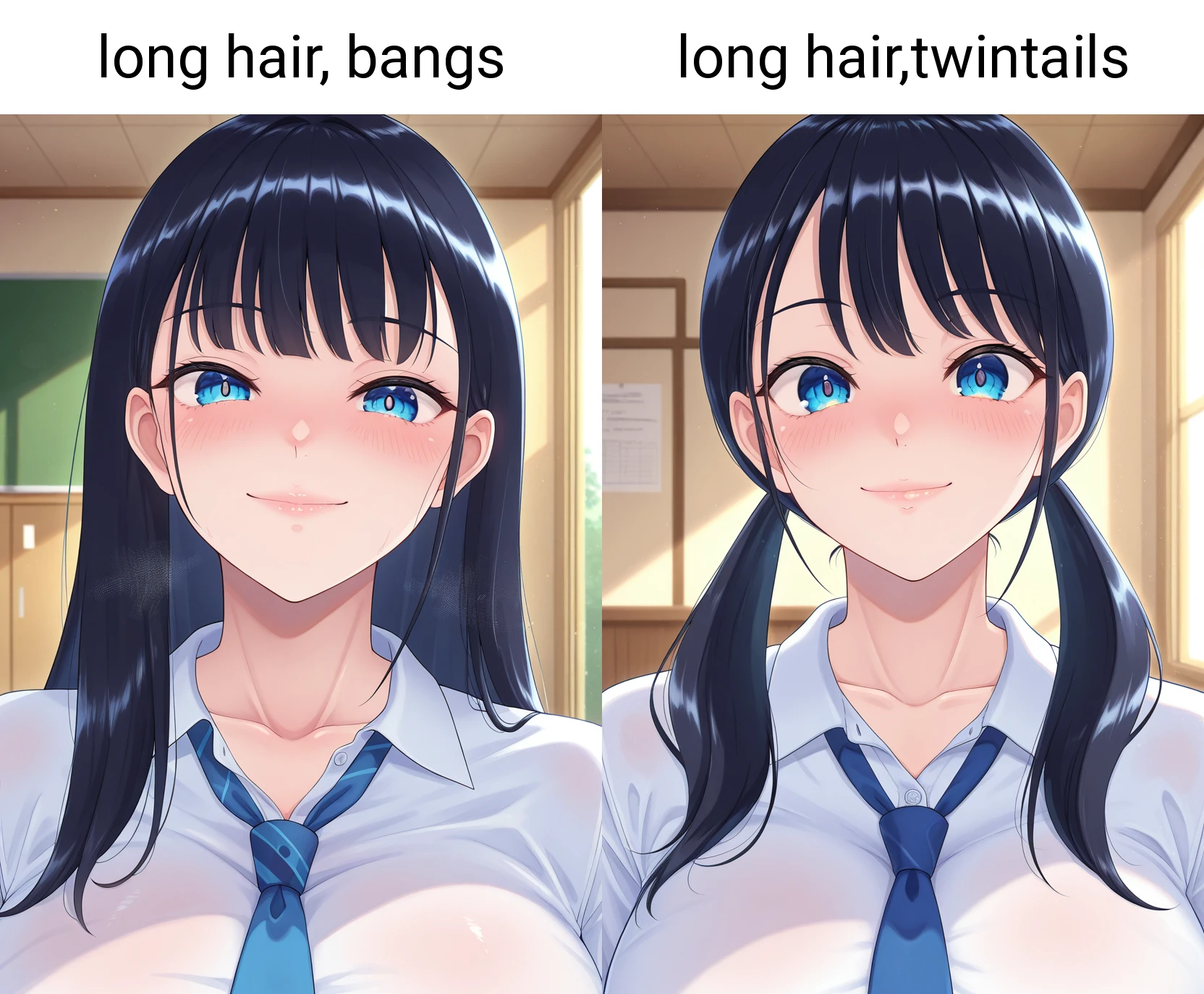 miuww, blue eyes, black hair, long hair, bangs, large breasts,