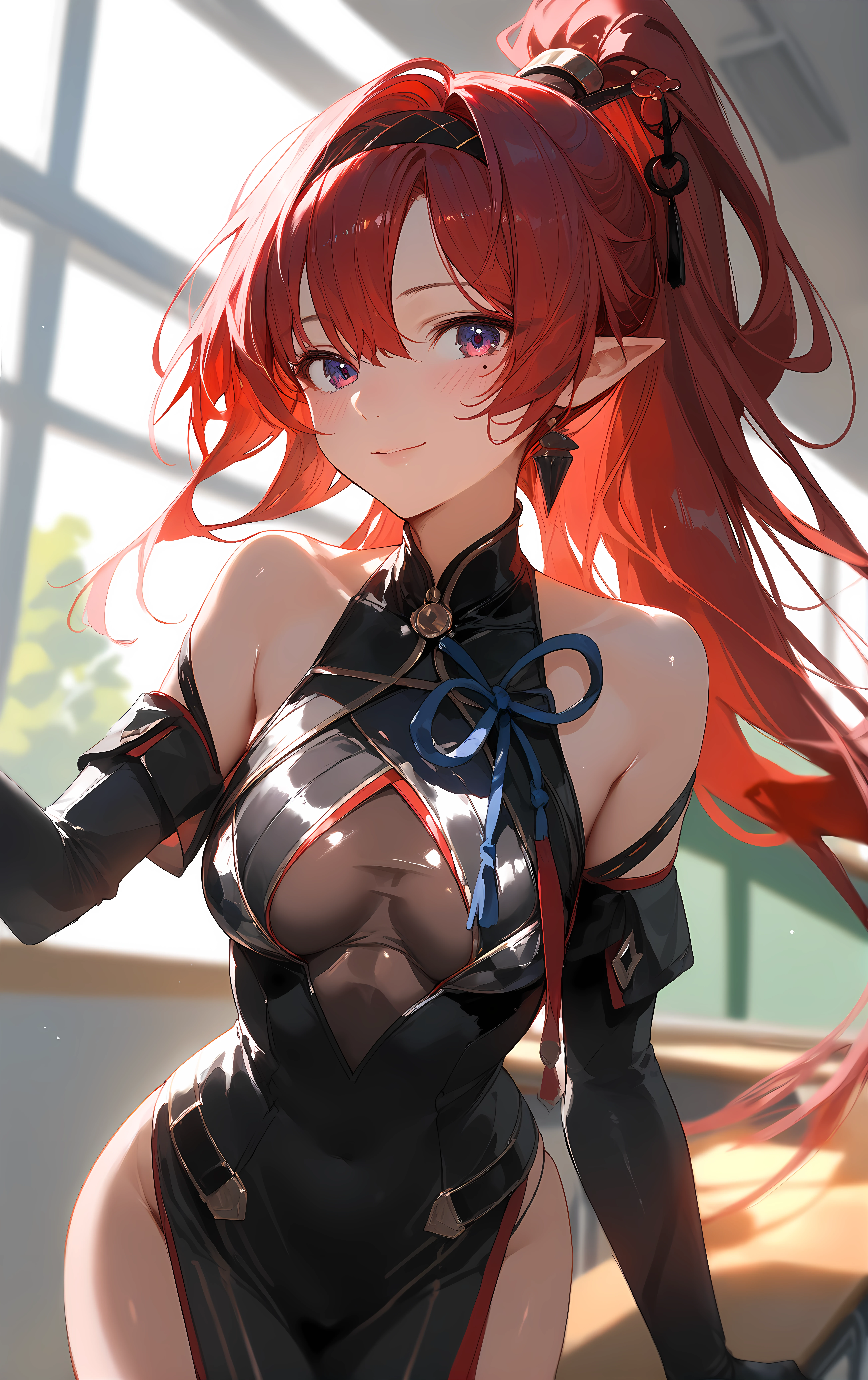 1girl, breasts, long_hair, large_breasts, solo, thighs, purple_eyes, red_hair, pointy_ears, gloves, hair_ornament, mole_under_eye, mole, ponytail, bare_shoulders, parted_lips, elbow_gloves, black_gloves, hairband, dress, black_dress, black_hairband, very_long_hair, hair_between_eyes,