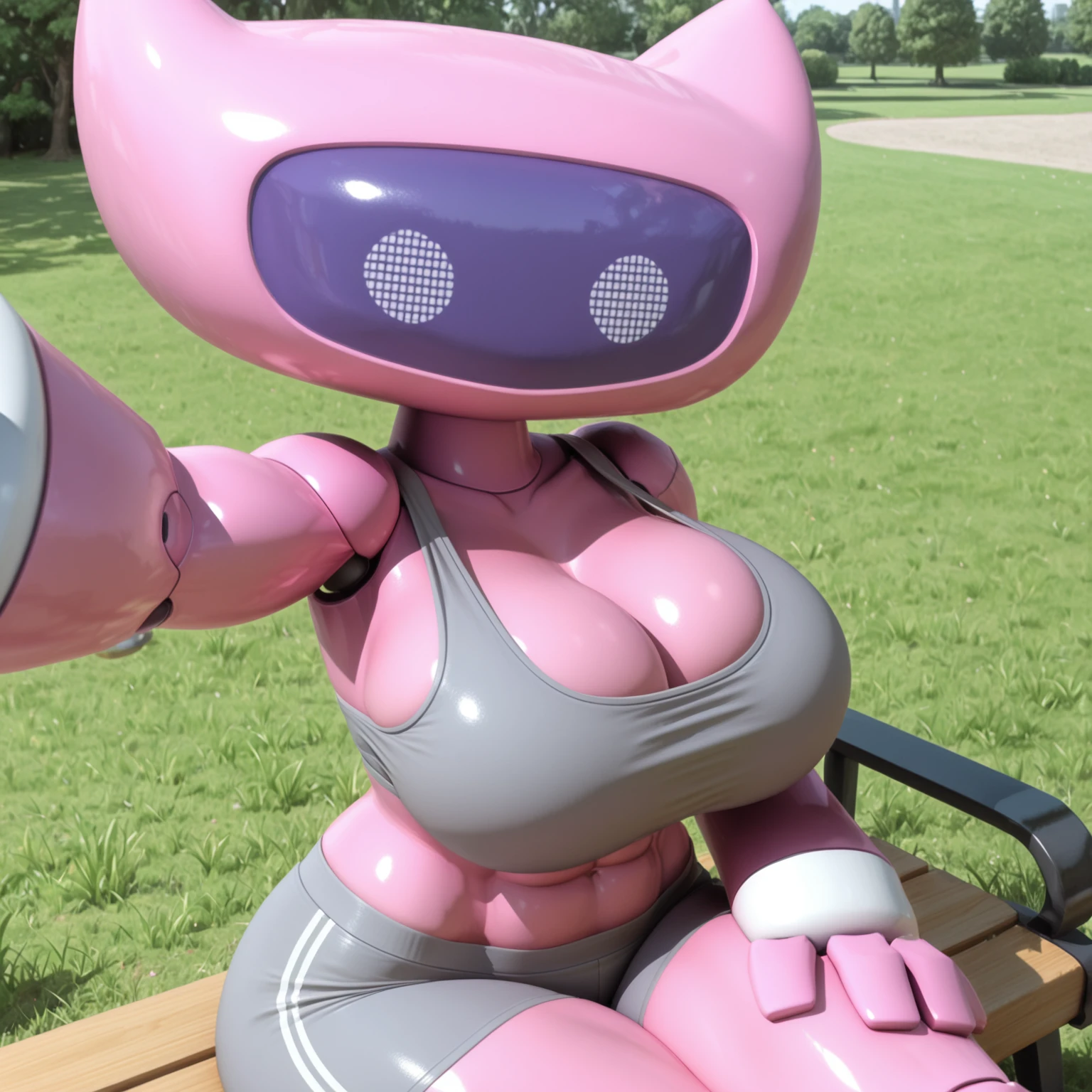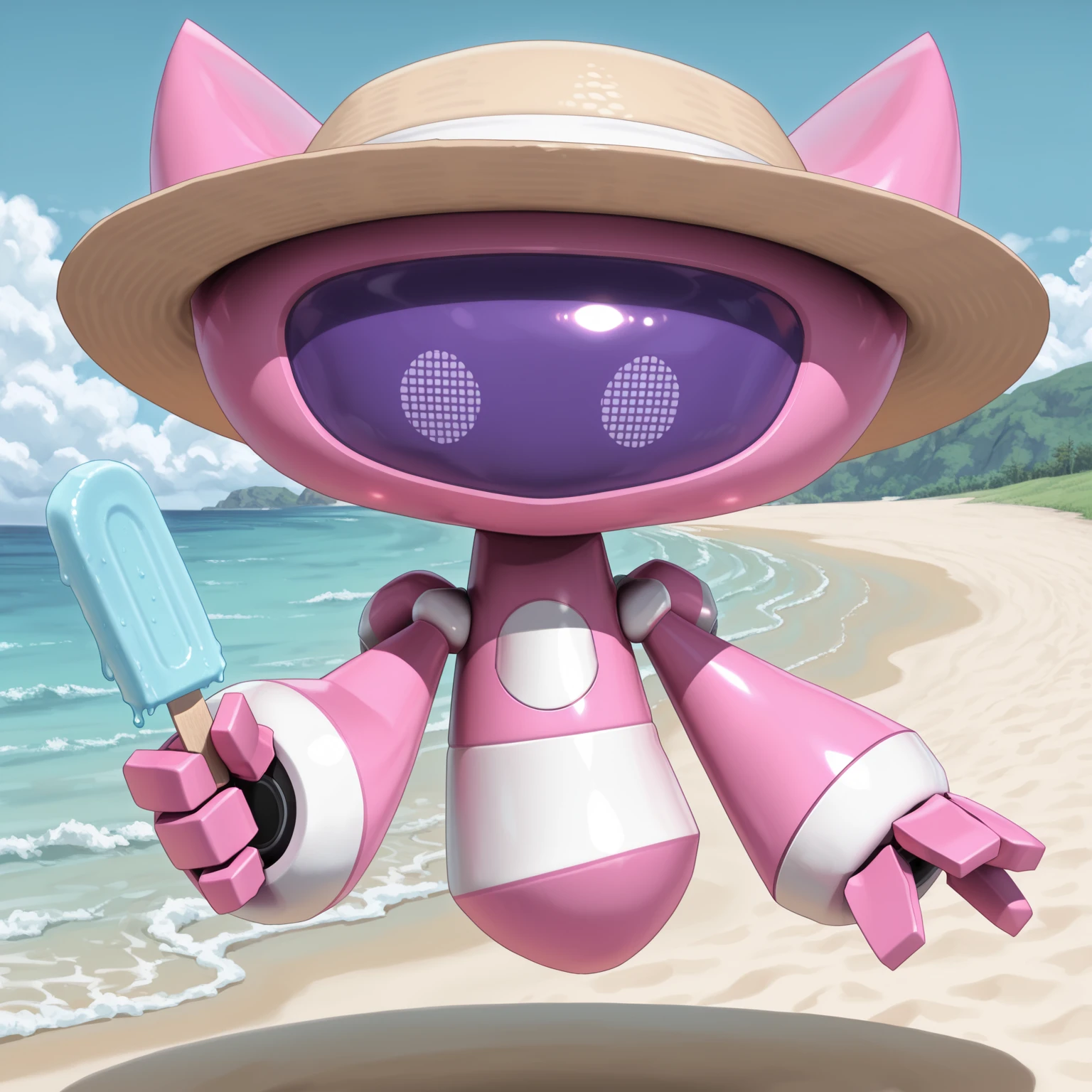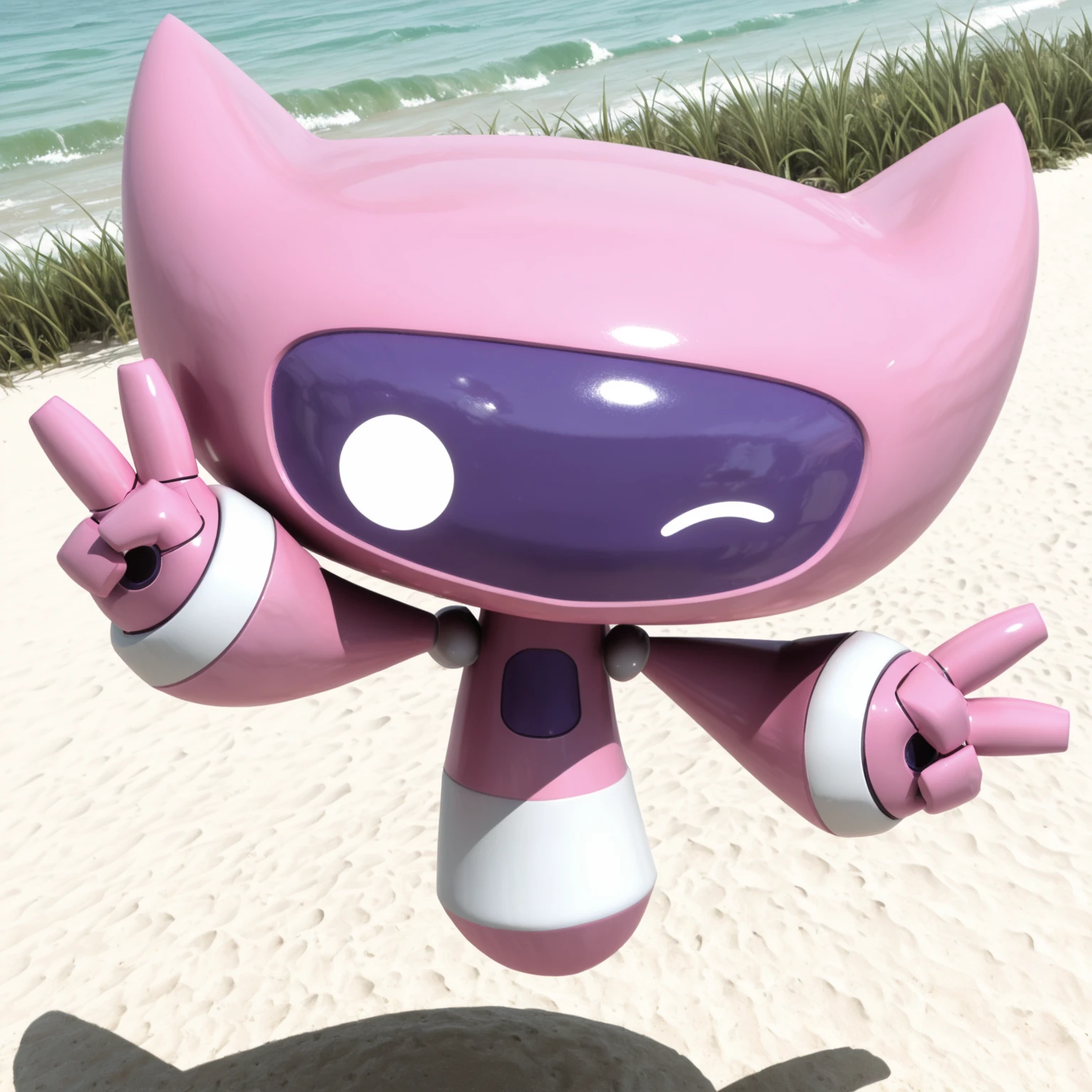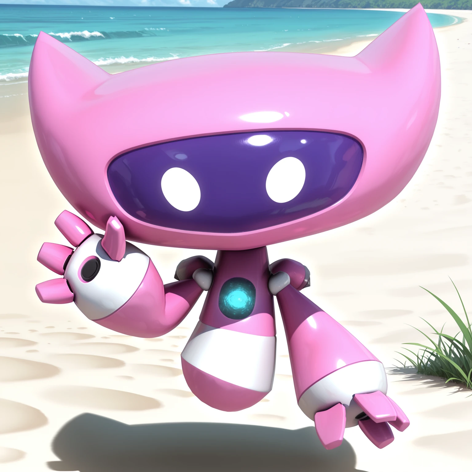 Positive Prompts: PinkyDB, full body, female robot, purple screen face, white eyes, no pupils, pink body, white stripe, white wrists, metallic body, legless, floating, mouthless