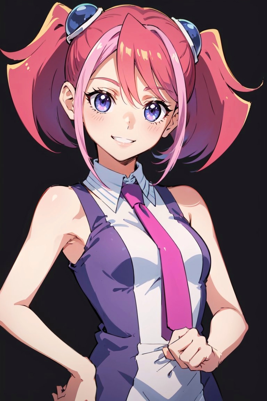 For her original outfit use the tags: pikkyyuzu, 1girl, solo, looking at viewer, pink hair, multicolored hair, two-tone hair, twintails, short twintails, blue eyes, purple eyes, breasts, small breasts, hair ornament, necktie, sleeveless, thighhighs, skirt, zettai ryouiki, black thighhighs
