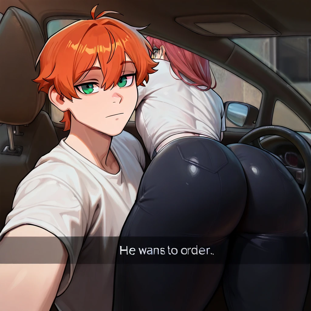 mikus-concept, looking at viewer, ass, duo, selfie, car interior, steering wheel, side-view mirror, car seat