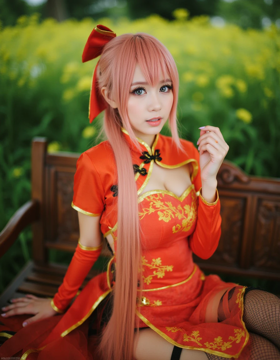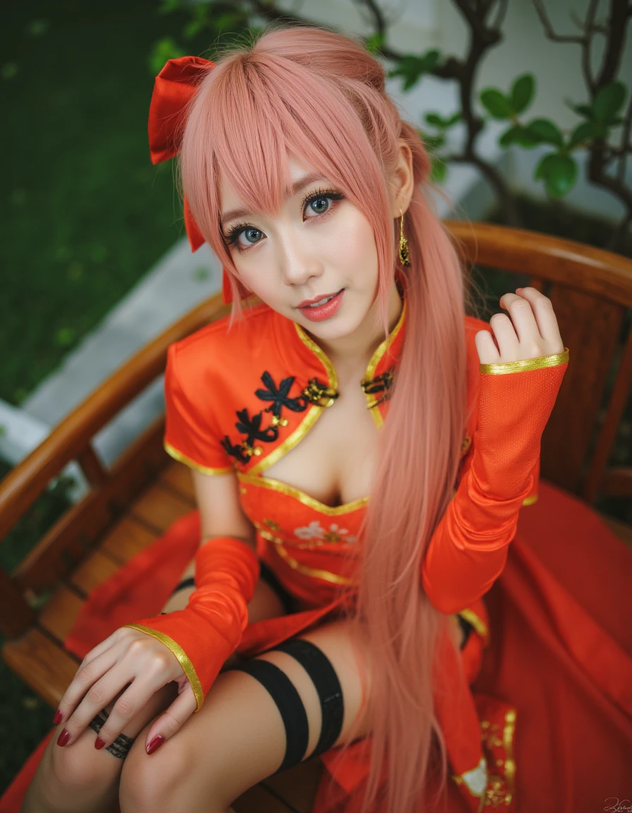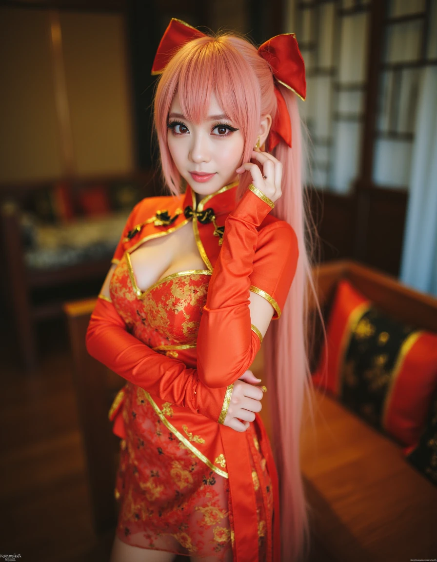 chines3luka. a woman in red chinese dress and a very long pink hair standing with alluring pose. She has a fairer skin, beautiful blue eyes, large breasts with visible cleavage and wearing a garter belt