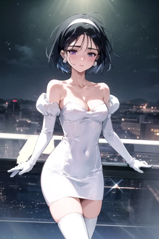SuaAlienStage, 1girl, solo, short hair, black hair, thighhighs, elbow gloves, long sleeves, white dress, cleavage, bare shoulders, jewelry, medium breast, purple eyes, collarbone, white hairband, earrings, puffy sleeves, white gloves, strapless, short dress