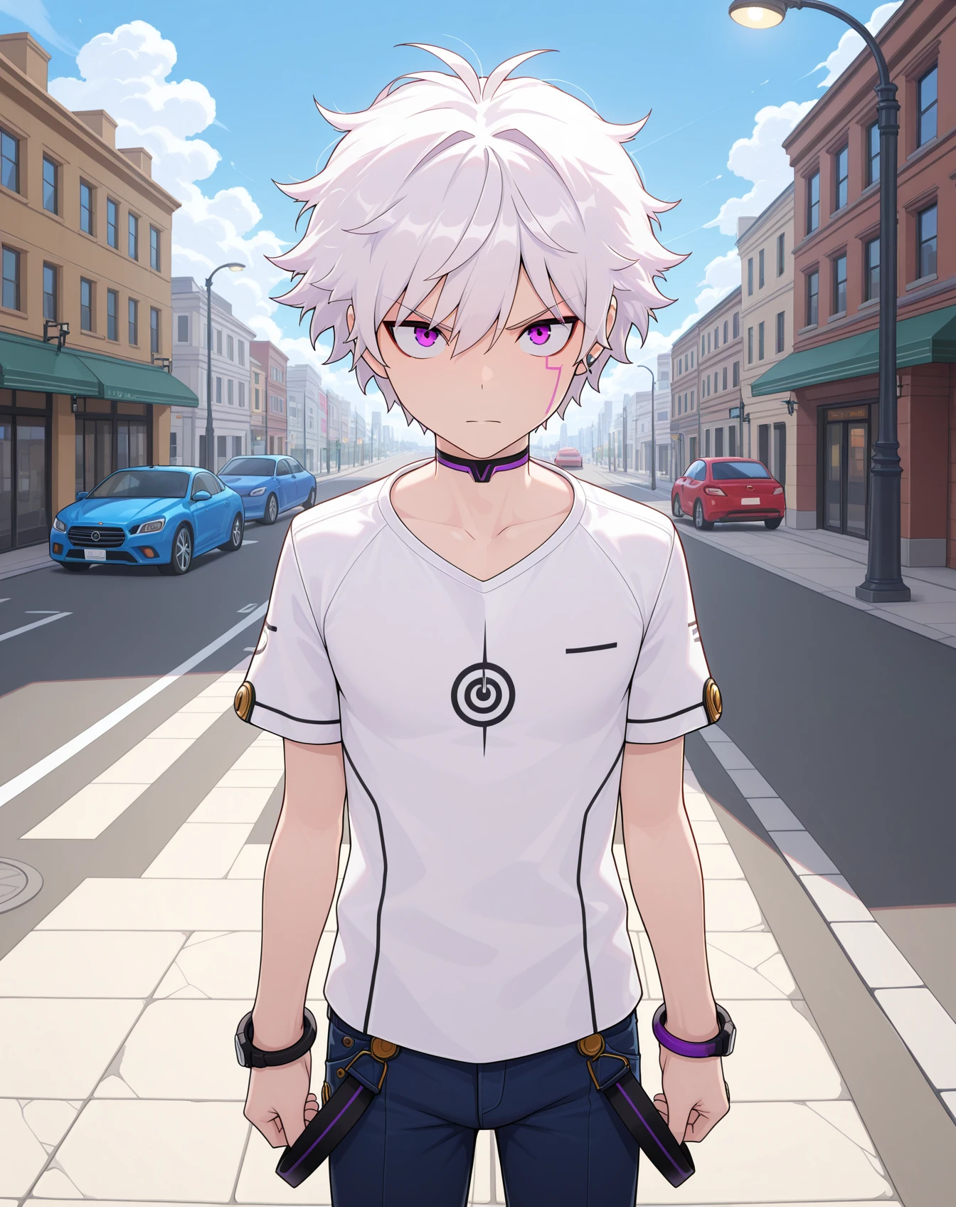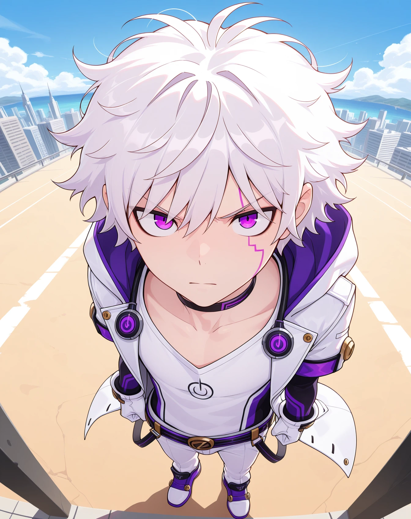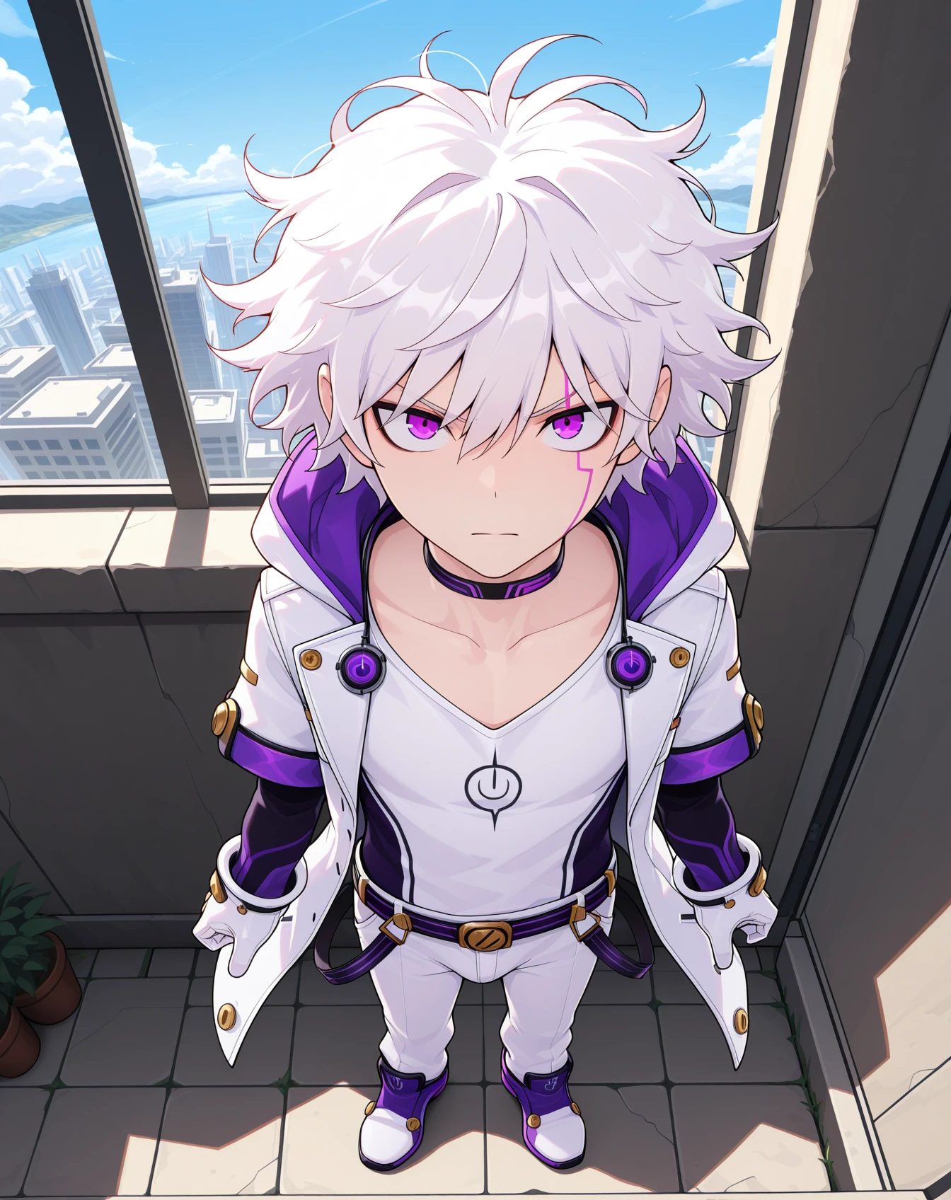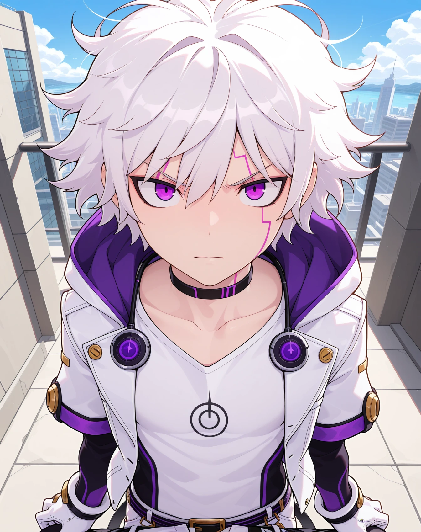 white gloves, white jacket, white pants, shirt,choker, hood, belt, shoes, two-tone footwear, white footwear, purple footwear,