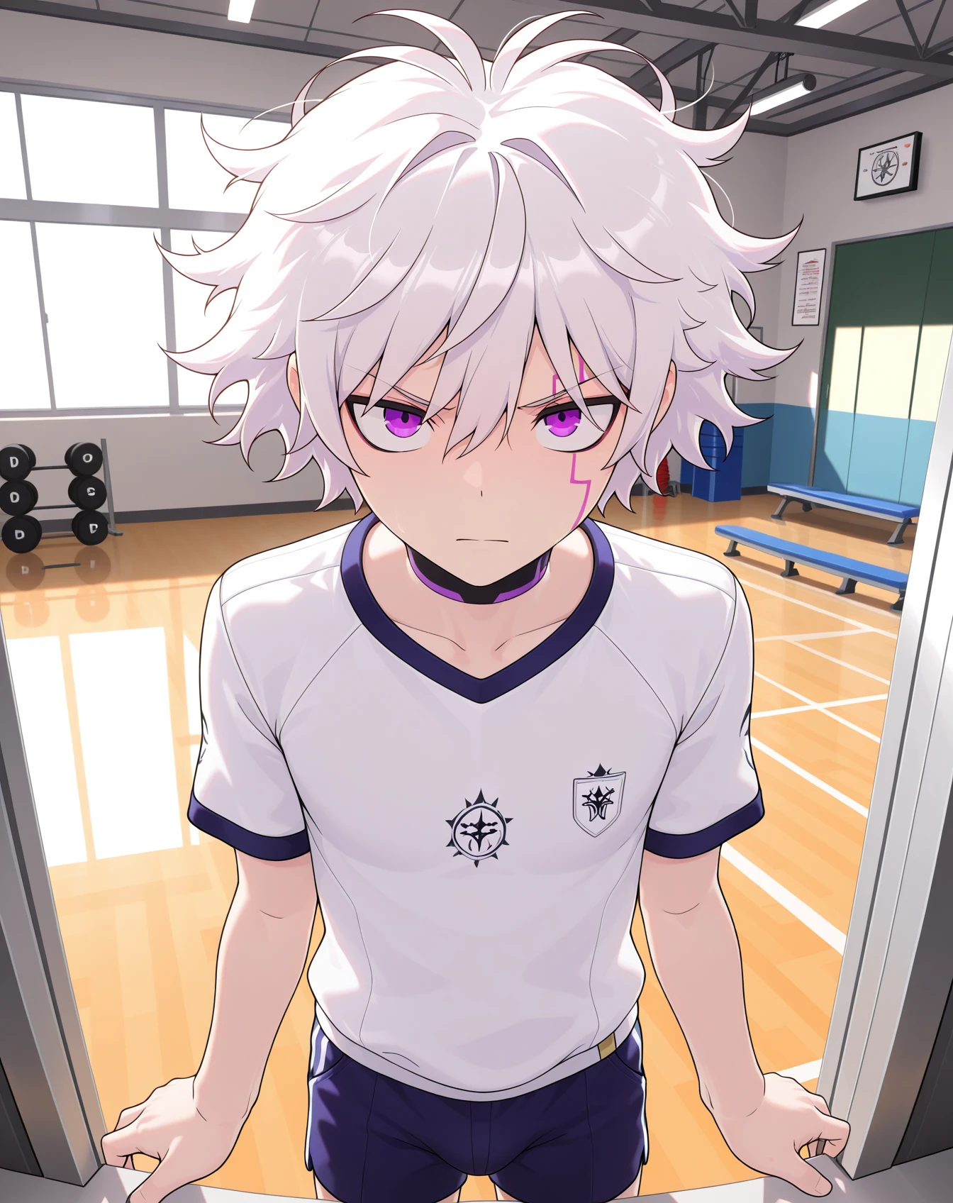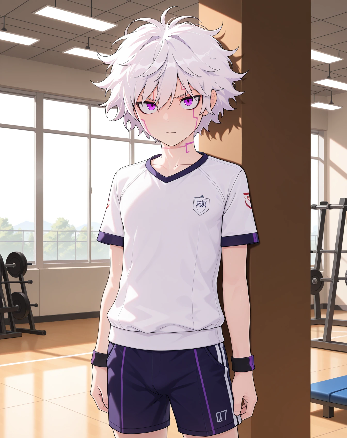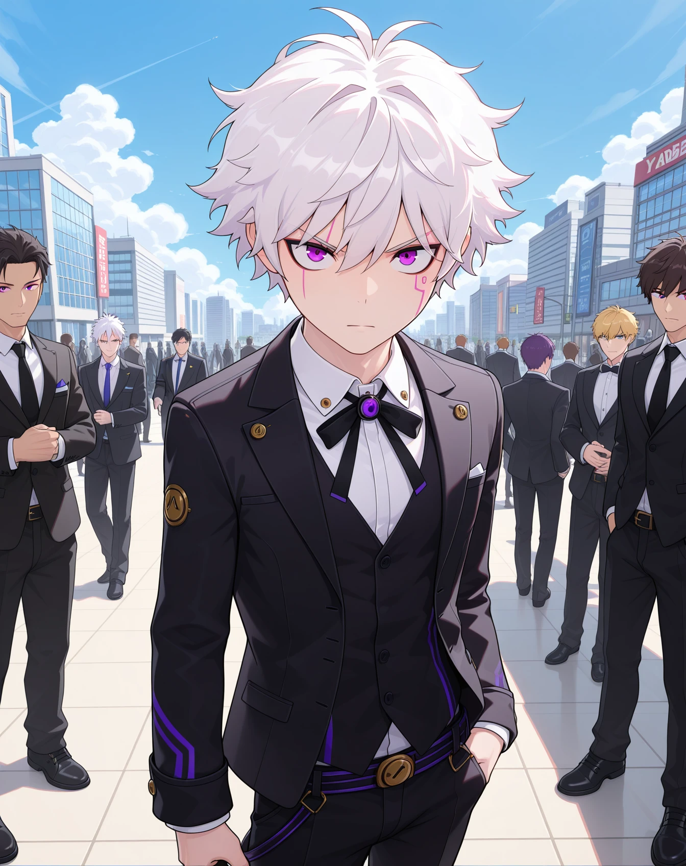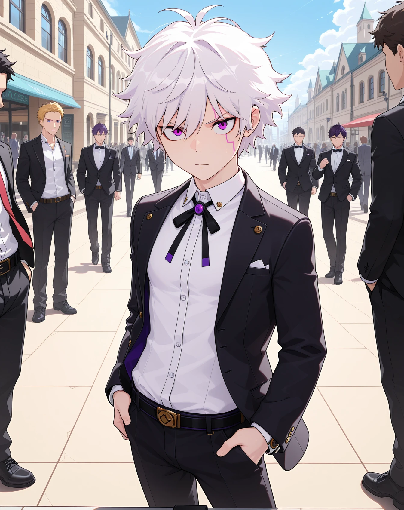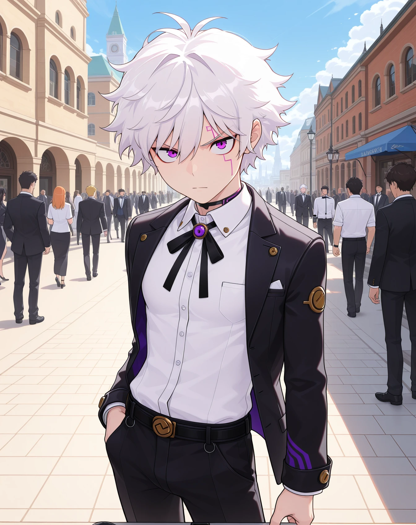 white gloves, white jacket, white pants, shirt,choker, hood, belt, shoes, two-tone footwear, white footwear, purple footwear,