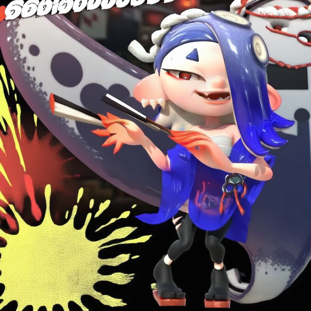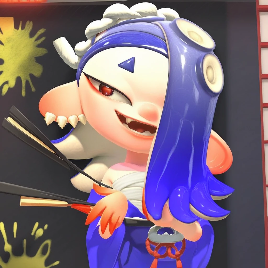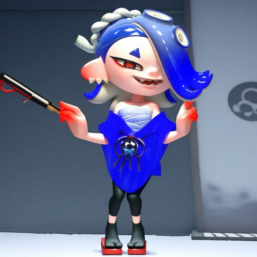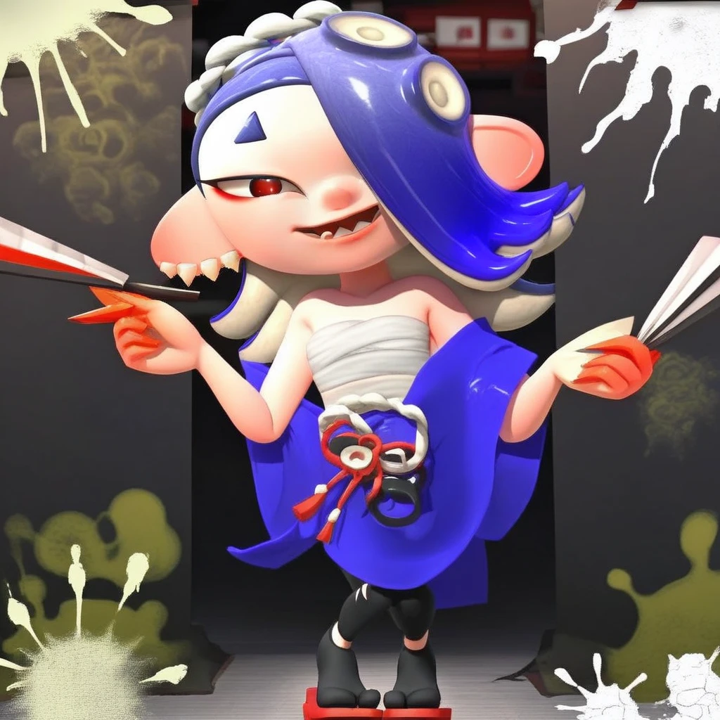 1 girl, Shiver, tentacle hair, blue hair,hair over eye, hachimaki, red eyes, sarashi, black leggings,Black socks, Japanese sandals