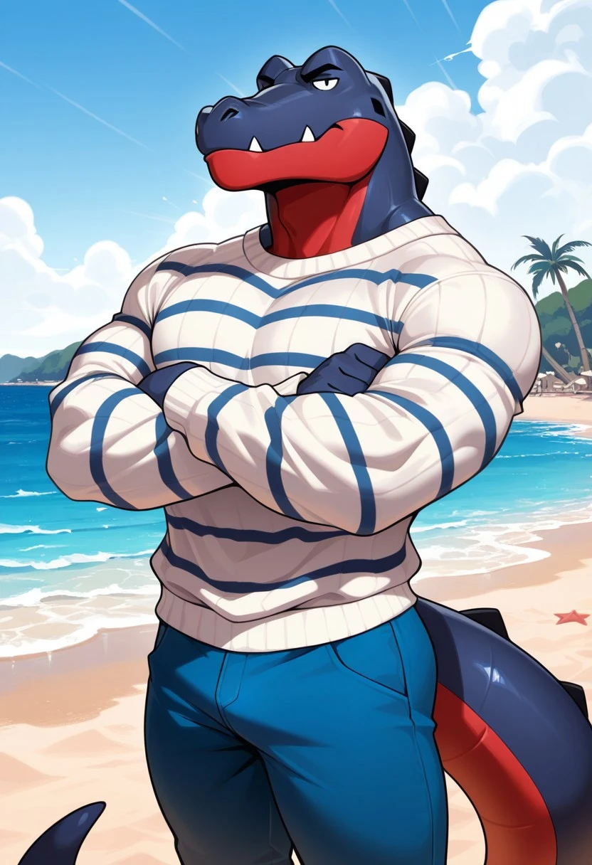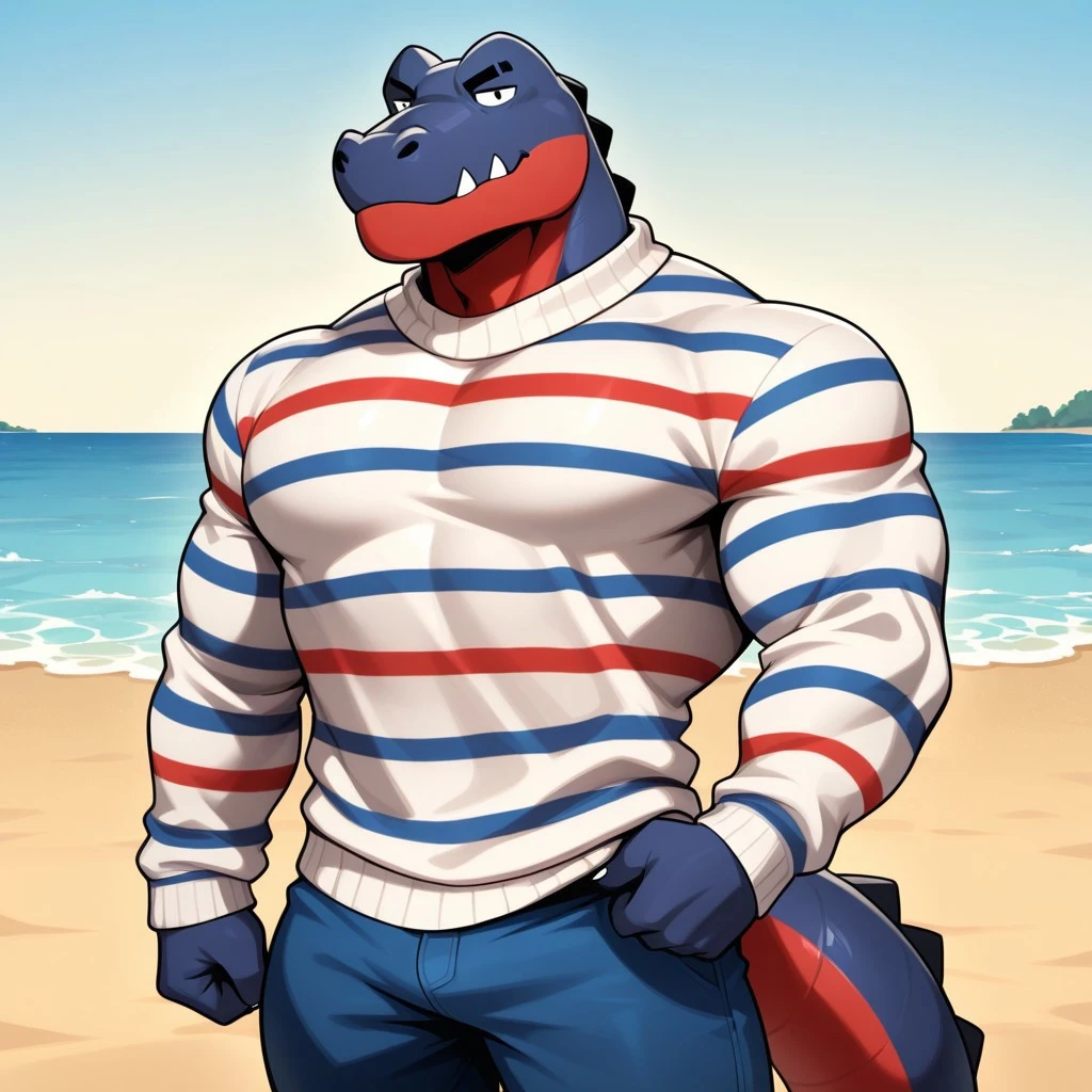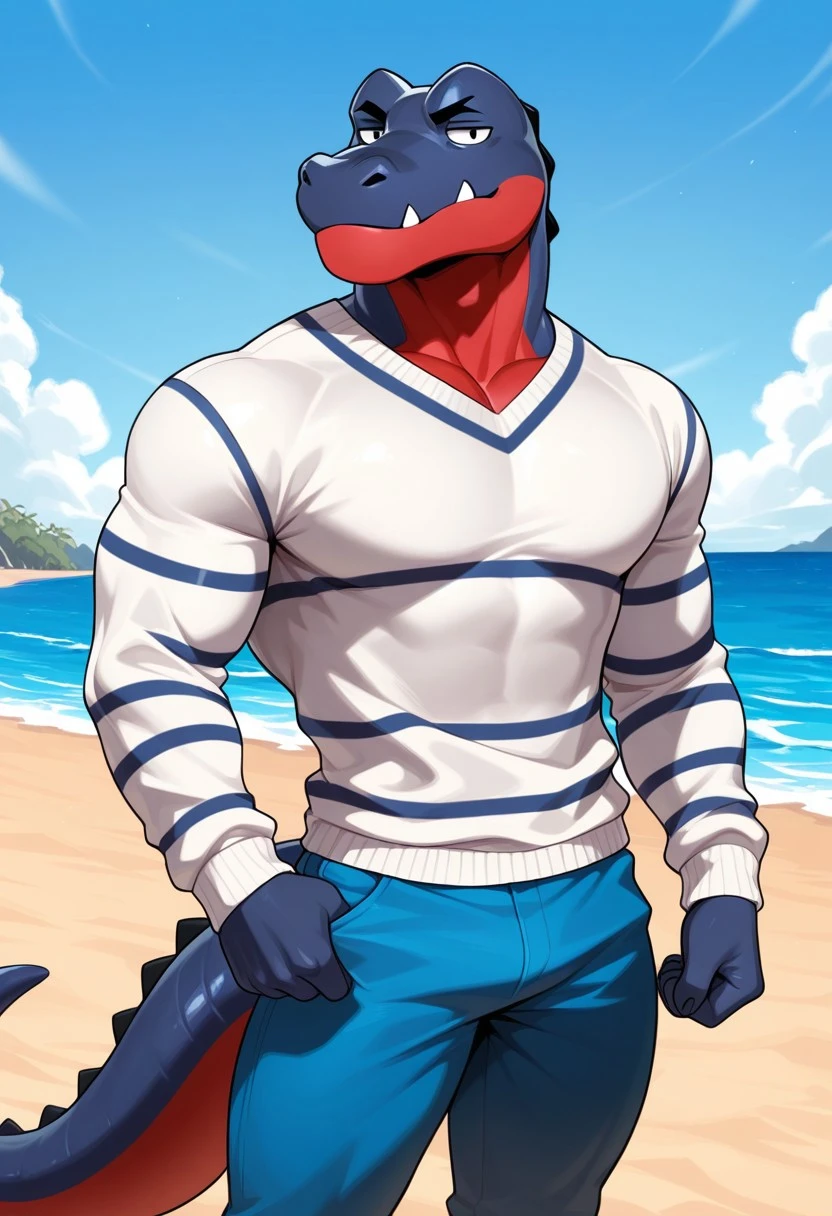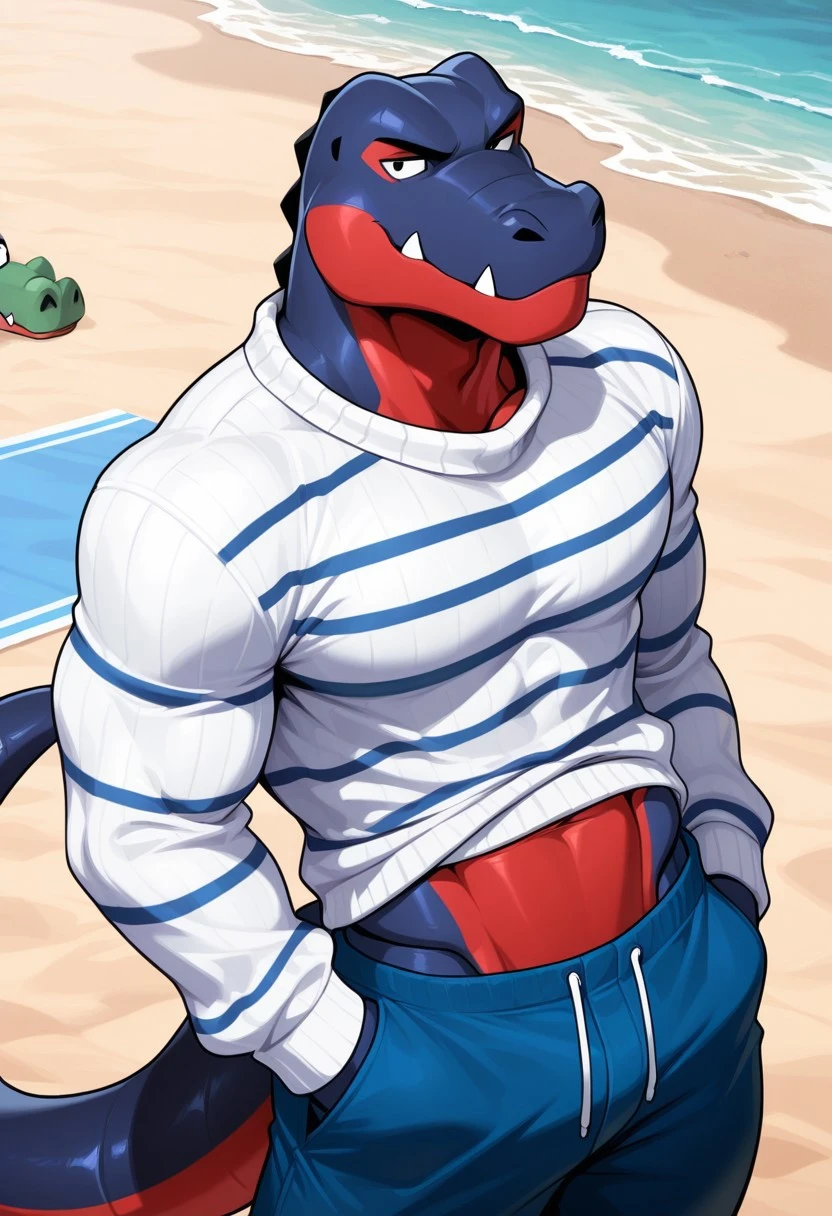 DelAC,furry,alligator,solo,male,navy-blue skin,red jaw,black eyes,striped blue white Sweater,red Stomach, small fangs, segmented tail