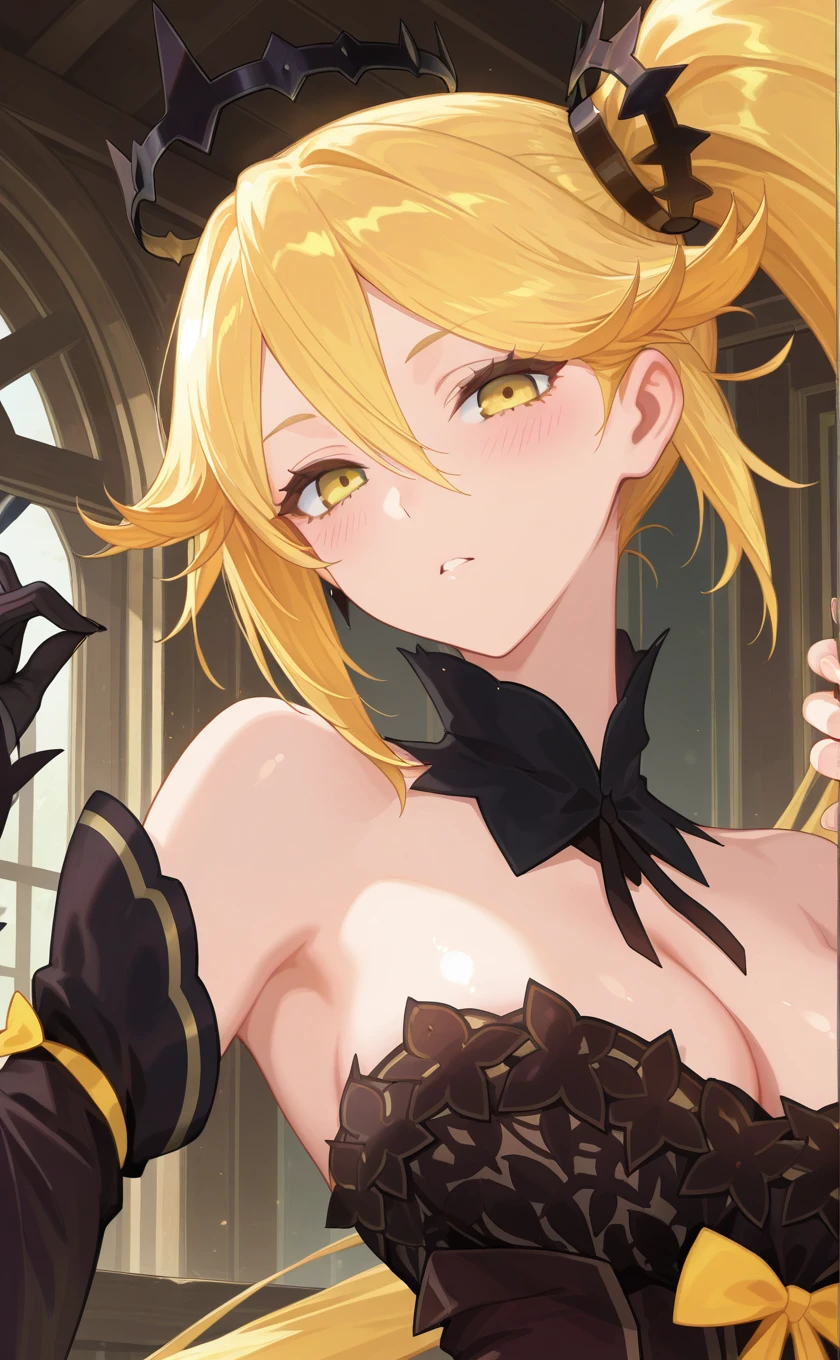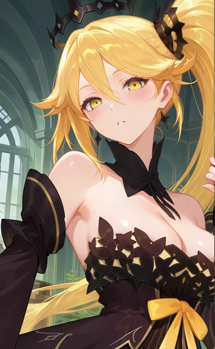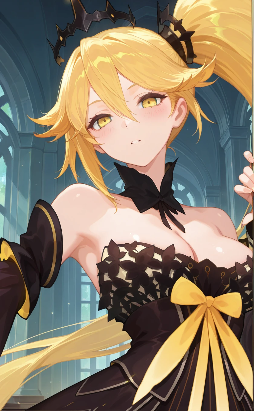 crown,very long hair,blonde hair,side ponytail,hair between eyes,yellow eyes
