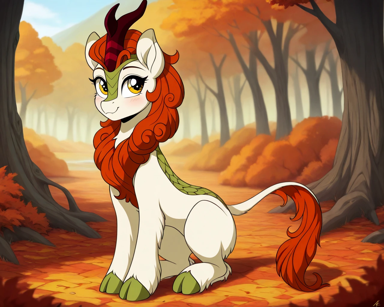tan fur, green scales, green hooves, orange hair, yellow eyes, red horn