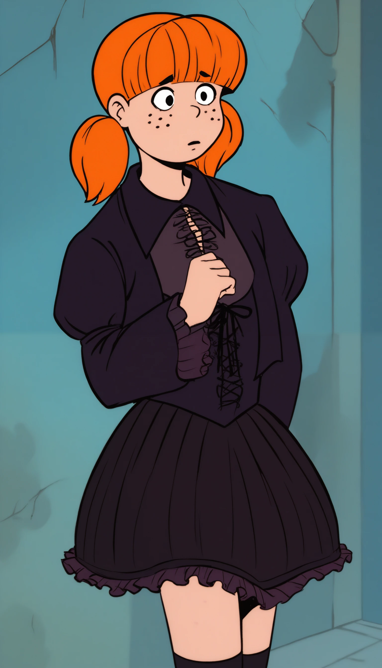 character tags: mezgakriszta, 1girl, freckles, orange hair, bangs, round eyes, black pupils, short twintails
