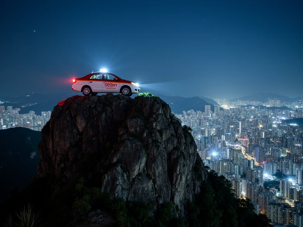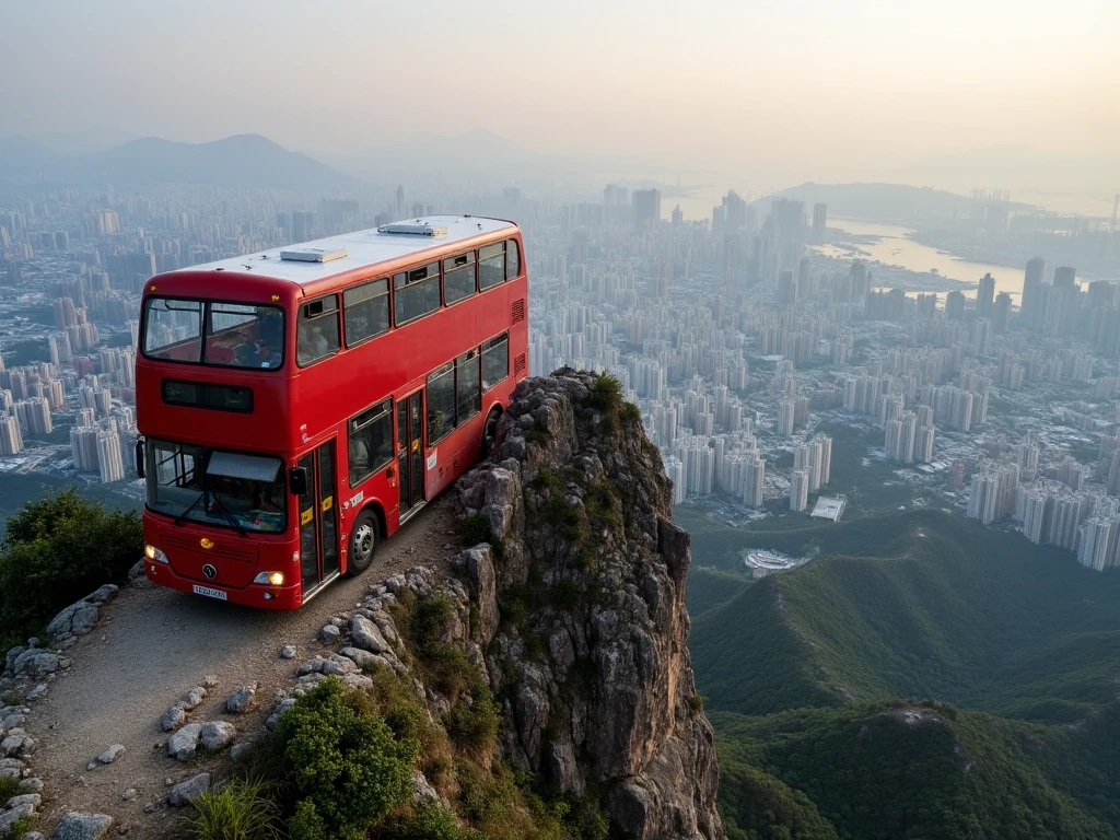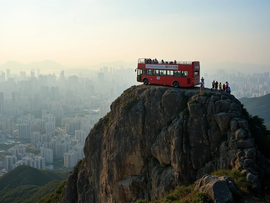 4. Whimsical scenarios (e.g., a double-decker bus or taxi atop the peak)