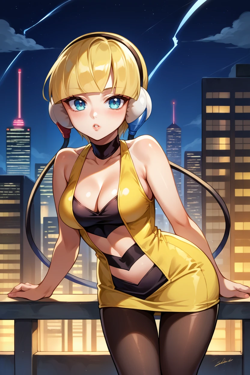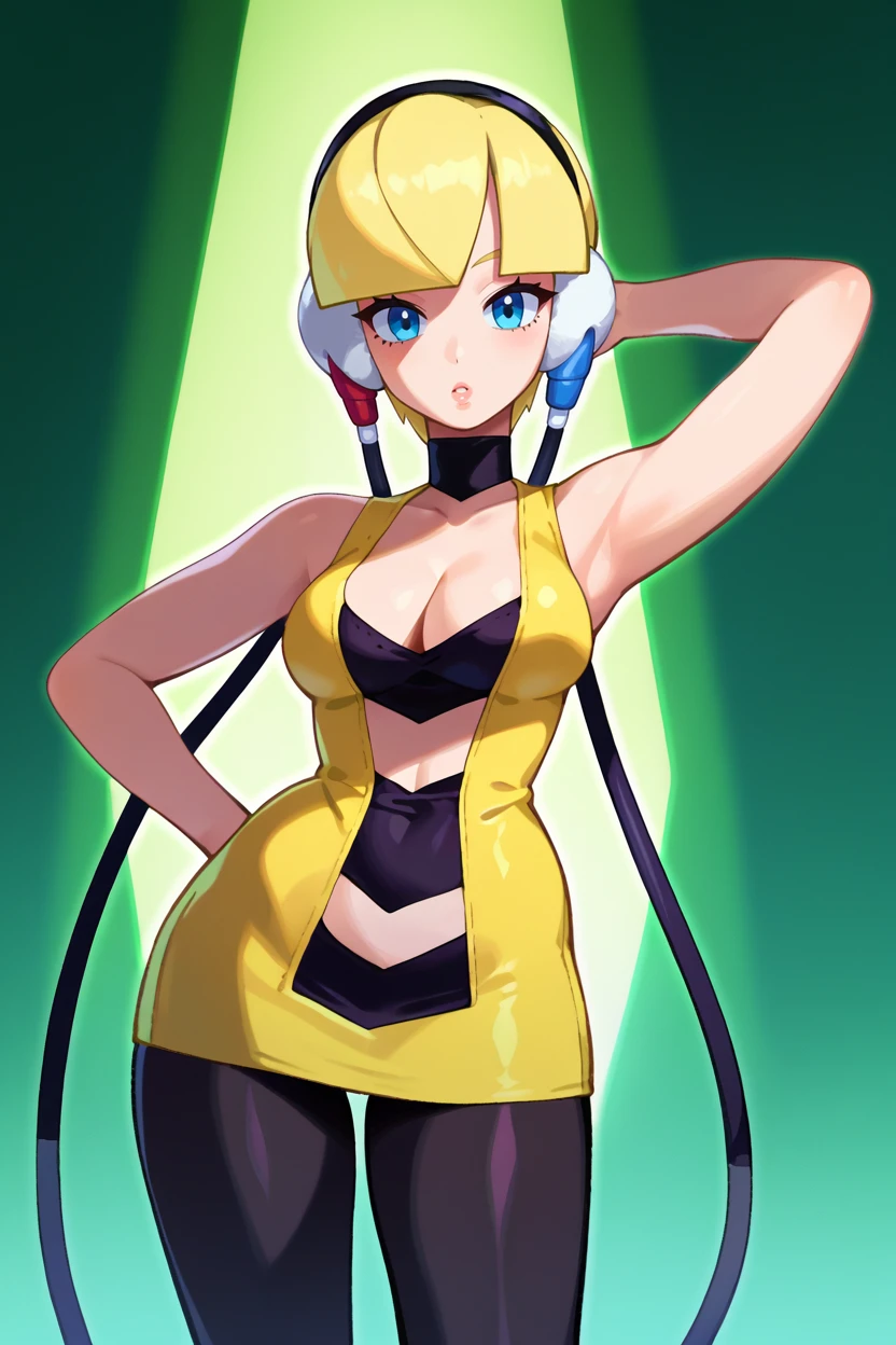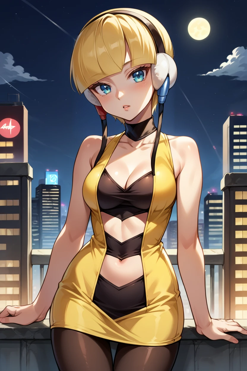 Add "bw1ele, blonde hair, short hair, headphones, cable, choker, cleavage, black and yellow dress, short dress, clothing cutout, navel cutout, sleeveless, pantyhose" for her BW1 appearance.