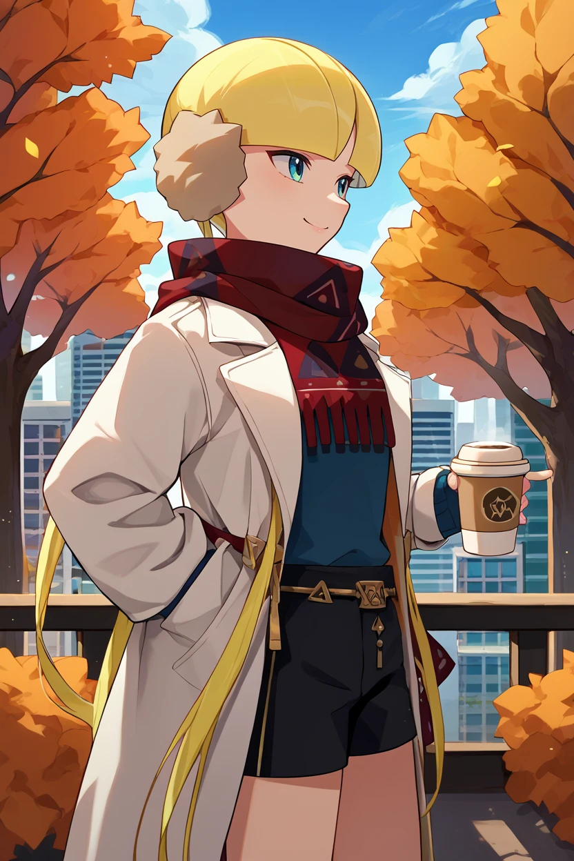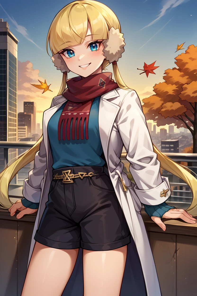 Add "palEle, blonde hair, earmuffs, twintails, red scarf, white coat, blue shirt, black shorts" for her Palentine's 2023 appearance.