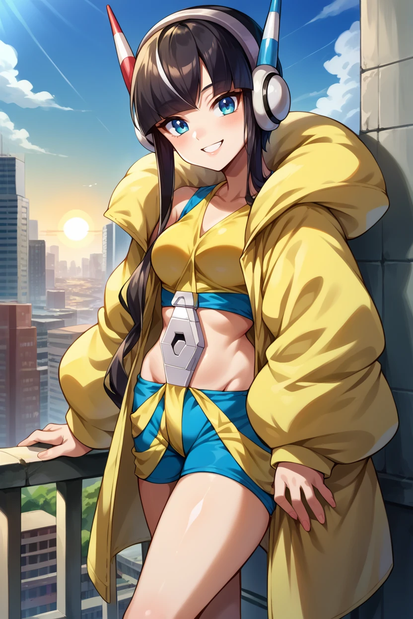 Add "bw2ele, black hair, streaked hair, long sidelocks, hair ornaments, headphones, yellow jacket, puffy jacket, crop top, yellow and blue shorts" for her BW2 appearance.
