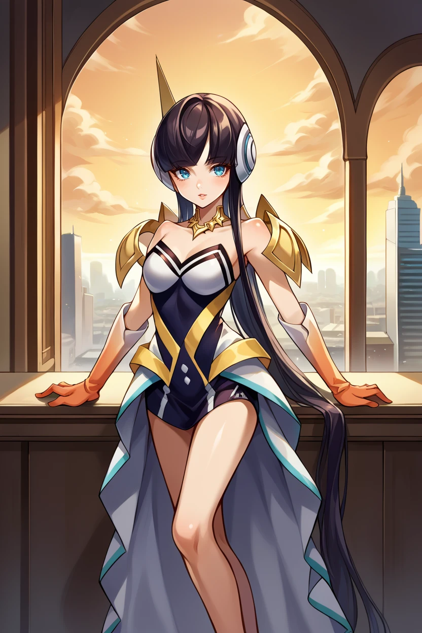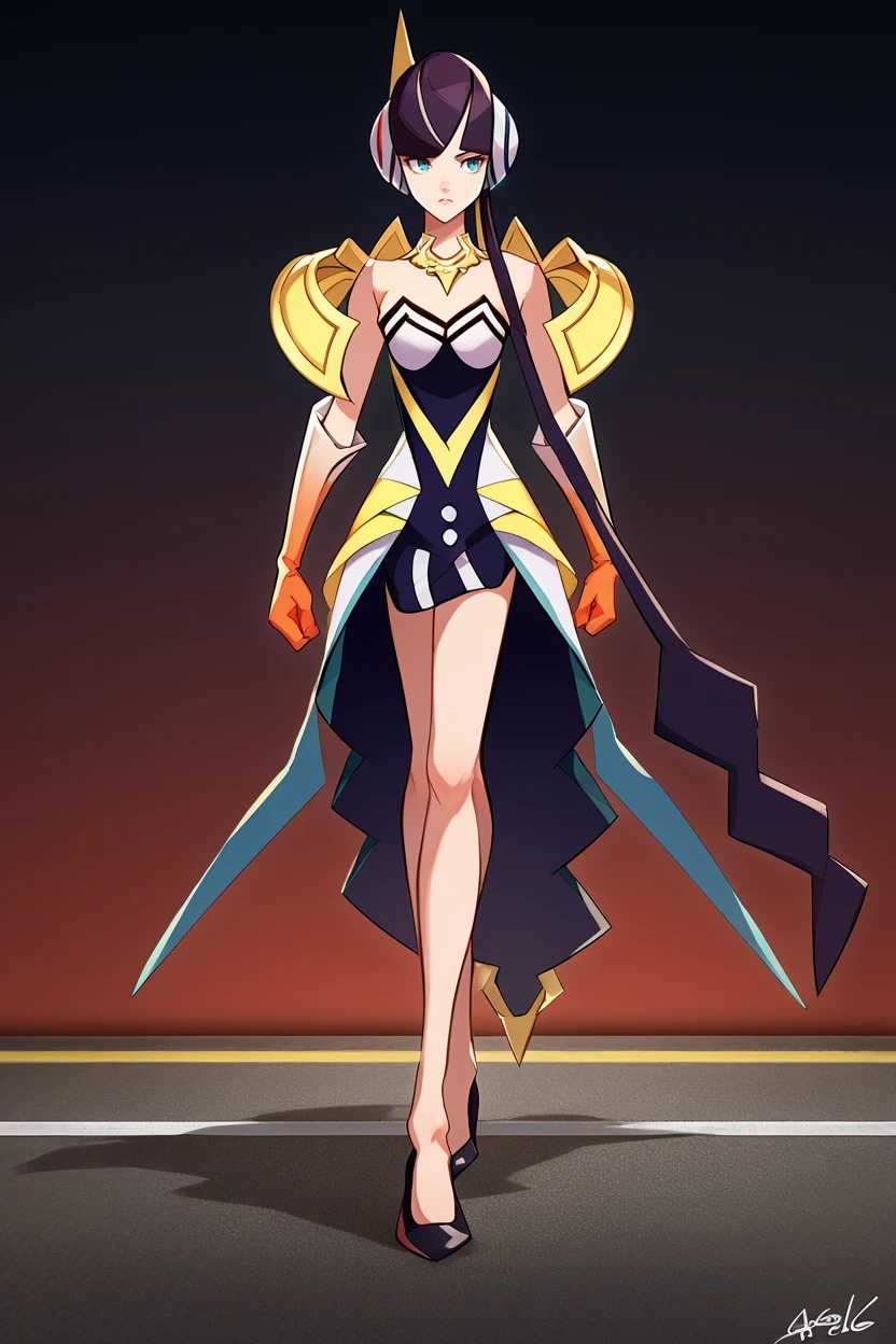 Add "sygnaEle, black hair, single sidelock, long sidelock, headgear, necklace, shoulder armor, black and white dress, strapless dress, elbow gloves" for her Sygna Suit.