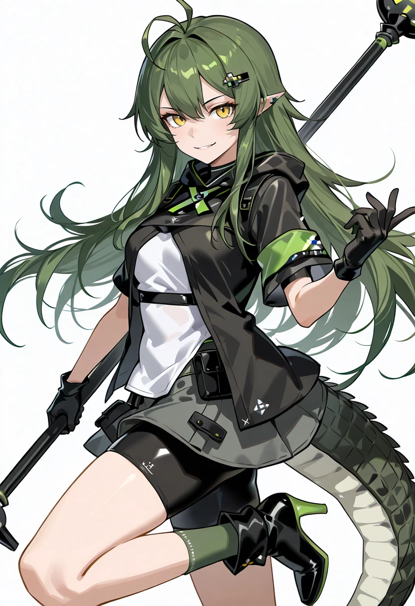 gavial_ak, gav_e2, green hair, long hair, hair between eyes, antenna hair, pointy ears, yellow eyes, crocodilian tail, green tail, hairclip, black jacket, hooded jacket, green tie, cross tie, white shirt, short sleeves, green armband, harness, black gloves, black pouch, grey skirt, shorts under skirt, bike shorts, black shorts, green socks, black shoes, heels