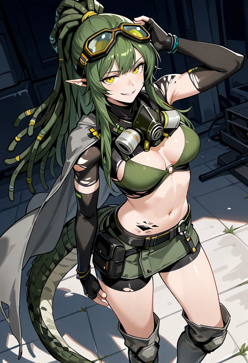 gavial_ak, gav_invincible, green hair, long hair, ponytail, dreadlocks, sidelocks, pointy ears, yellow eyes, crocodilian tail, green tail, goggles on head, goggles, mask around neck, respirator, grey cape, green bra, torn clothes, underbust, asymmetrical gloves, fingerless gloves, elbow gloves, black gloves, oripathy lesion (arknights), stomach tattoo, black belt, o-ring belt, green skirt, miniskirt, fanny pack, bike shorts, black shorts, torn shorts, open-toe_boots, thigh boots, grey boots