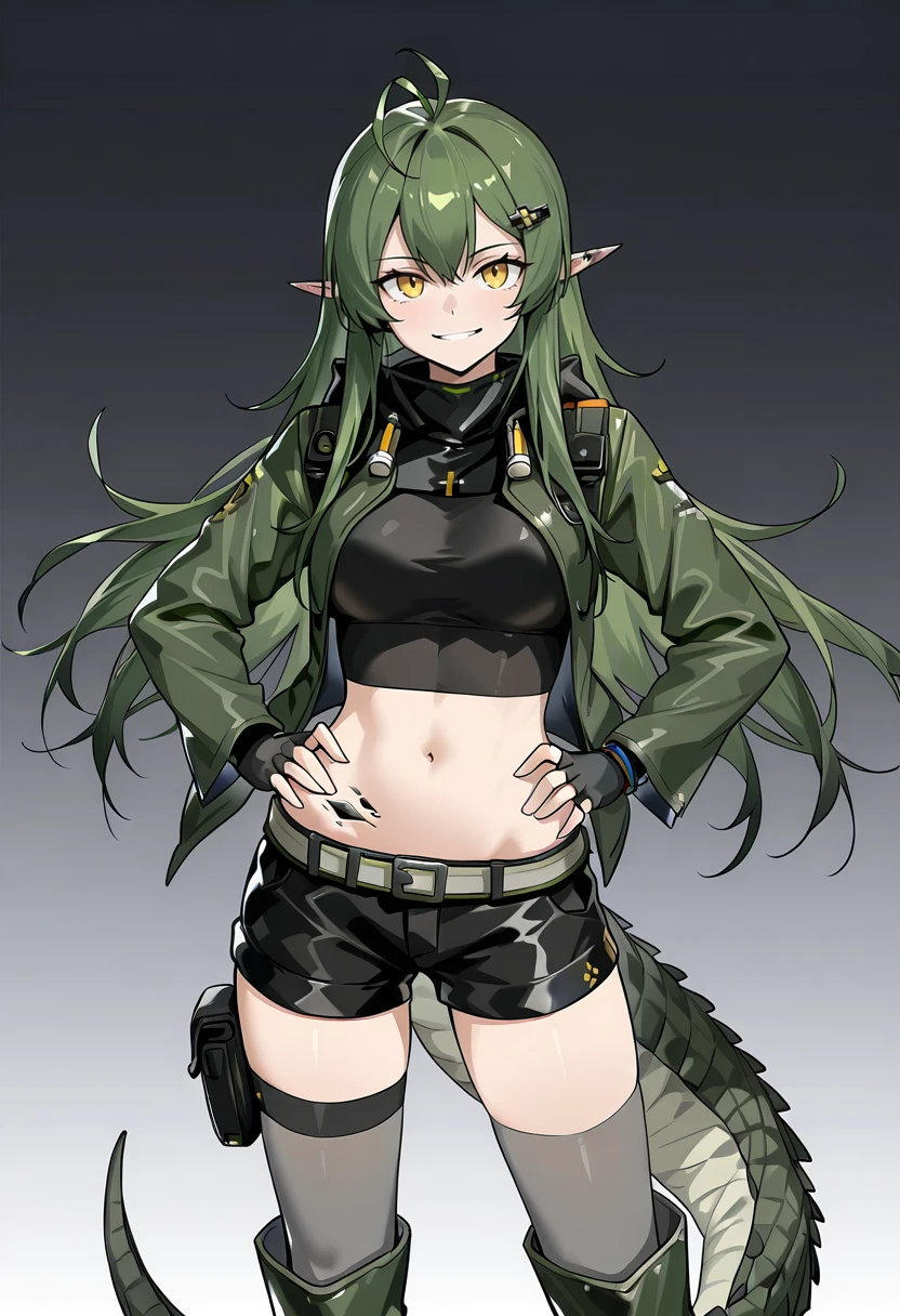 gavial_ak, gav_combatmed, green hair, long hair, hair between eyes, antenna hair, pointy ears, yellow eyes, crocodilian tail, green tail, hairclip, green jacket, long sleeves, black shirt, cropped shirt, turtleneck shirt, belt, fingerless gloves, black gloves, oripathy lesion (arknights), belt, black shorts, short shorts, black pouch, thigh pouch, grey thighhighs, green boots, thighboots