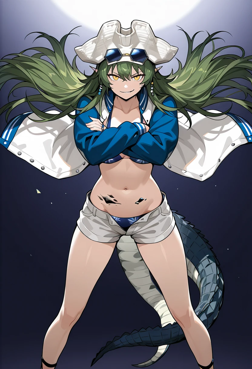 gavial_ak, invin_holiday, green hair, hair between eyes, long hair, pointy ears, yellow eyes, crocodilian tail, blue tail, white hat, tinted eyewear, eyewear on head, hair beads, white jacket, letterman jacket, blue sleeves, blue bikini, floral print bikini, rings, stomach tattoo, oripathy lesion (arknights), short shorts, white shorts, open shorts, ankle straps, sandalsDescription