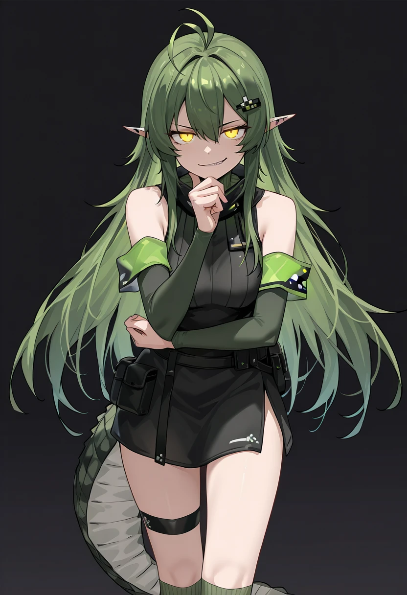 gavial_ak, gav_base, green hair, long hair, hair between eyes, antenna hair, pointy ears, yellow eyes, crocodilian tail, green tail, hairclip, turtleneck dress, black dress, short dress, shoulders, green armband, detached sleeves, side slit, black pouch, belt pouch, legwear garter, green socks, ribbed socks, black shoes, heels