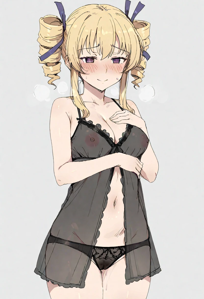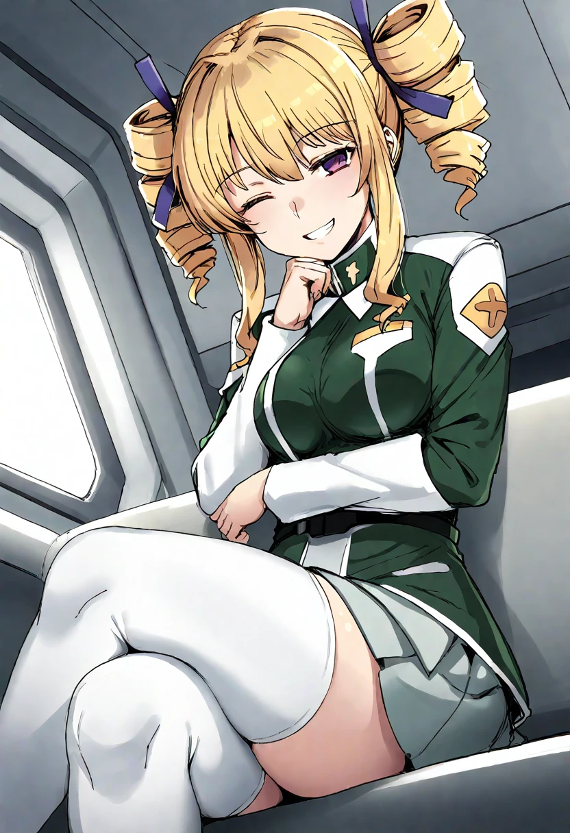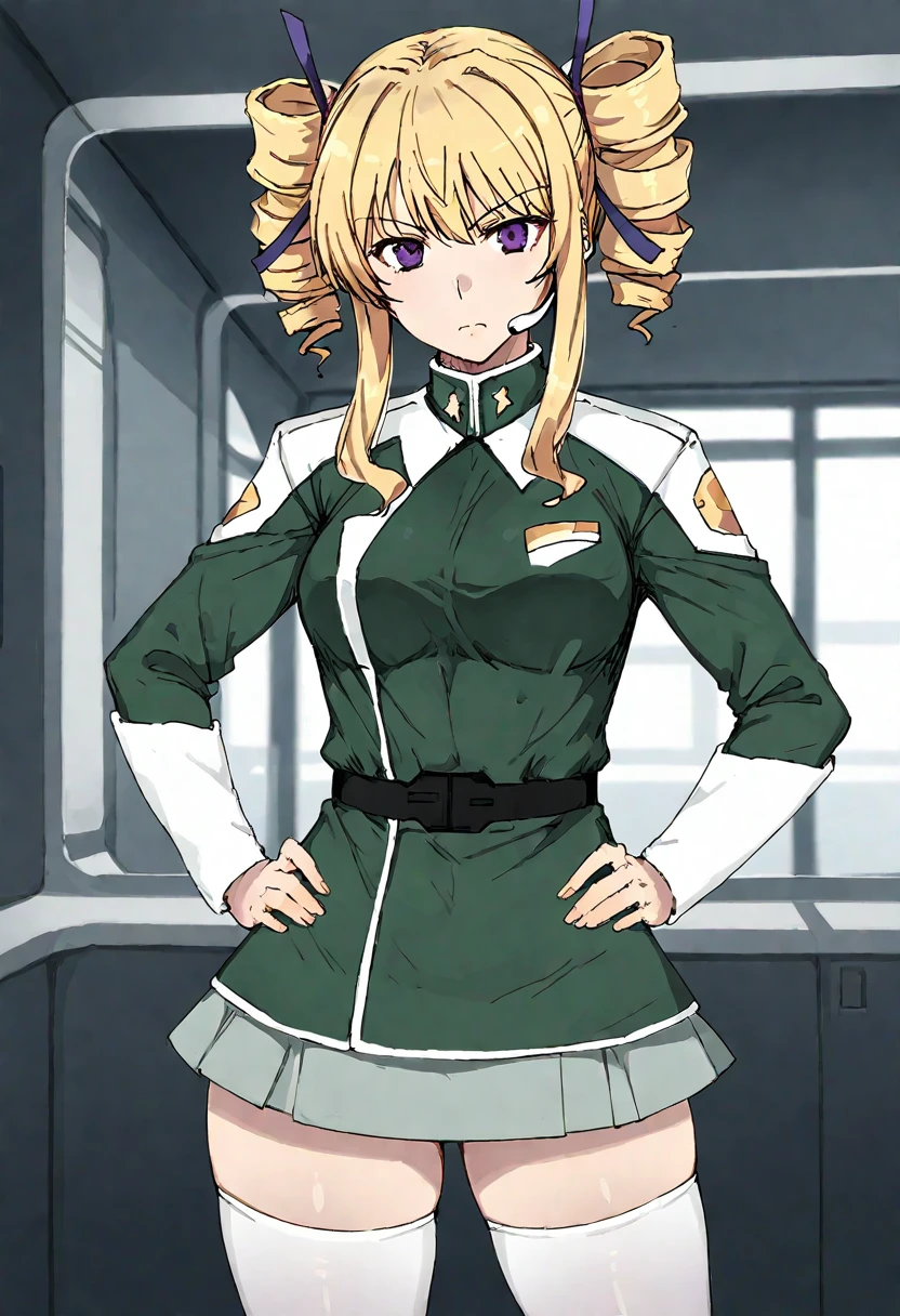 1girl,f_ko,blonde hair,twin drills,drill hair,purple eyes,sidelocks,hair ribbon,medium breasts,headset,military uniform,thighhighs,zettai ryouiki,grey skirt