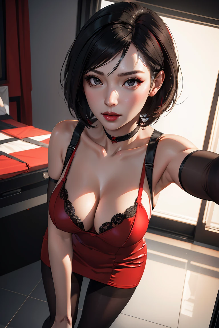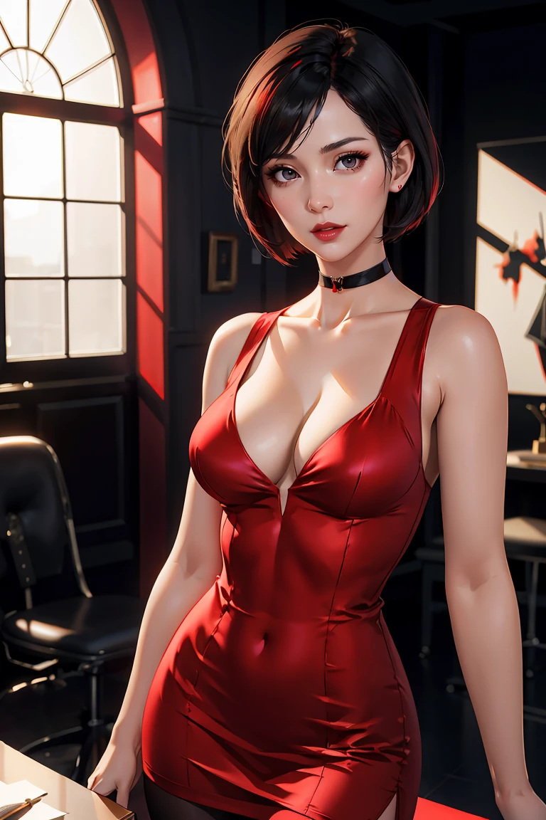 Outfit 3: red dress, pantyhose, cleavage, choker, short dress, sleeveless dress