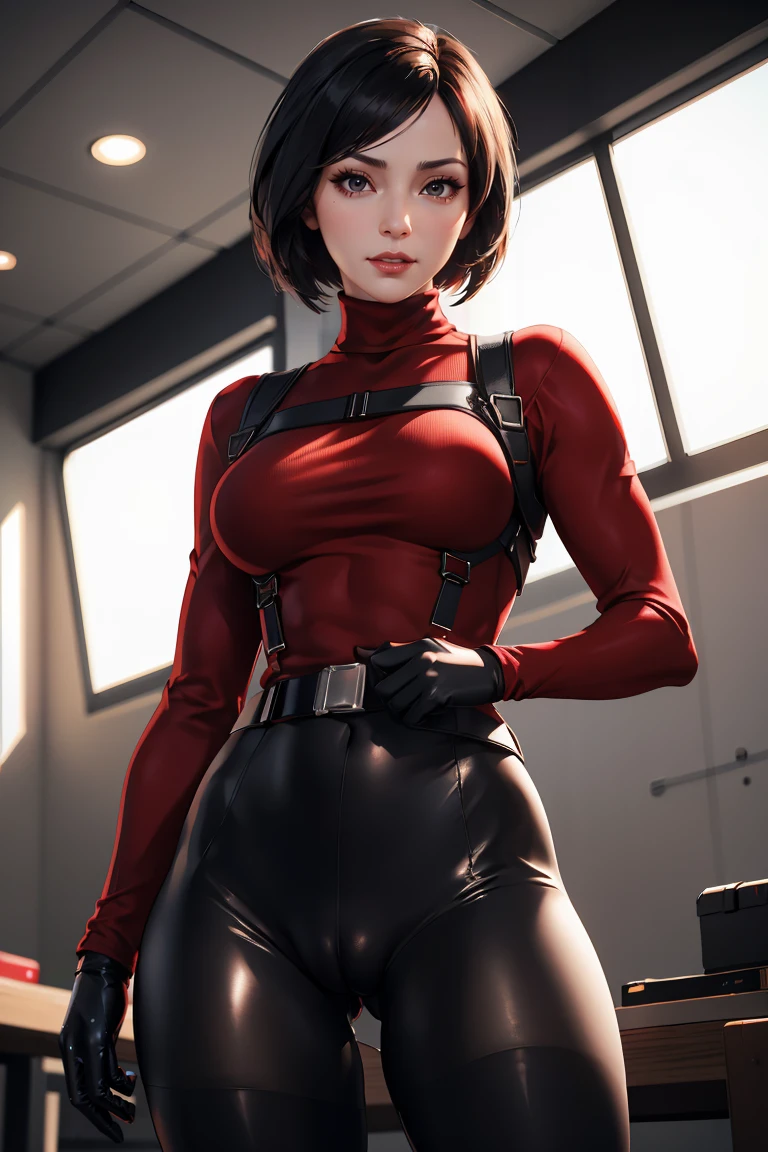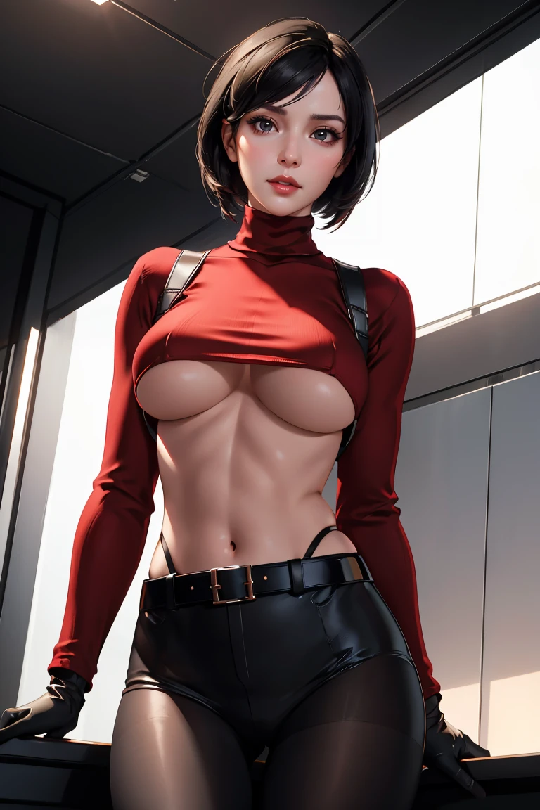 Outfit 1: red sweater, belt, black gloves, turtleneck, harness, pantyhose