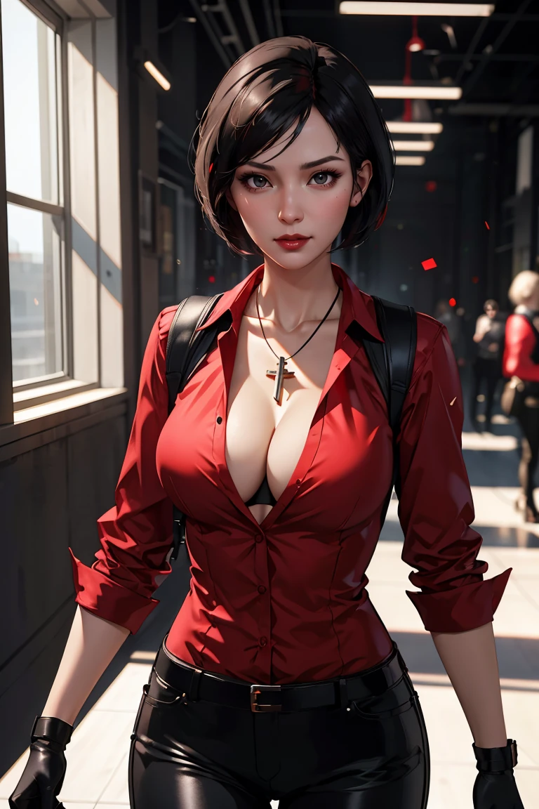 Outfit 2: red shirt, cross necklace, cleavage, black gloves, partially unbuttoned, black pants