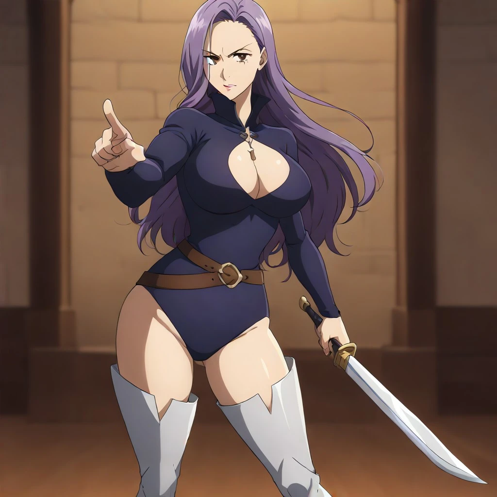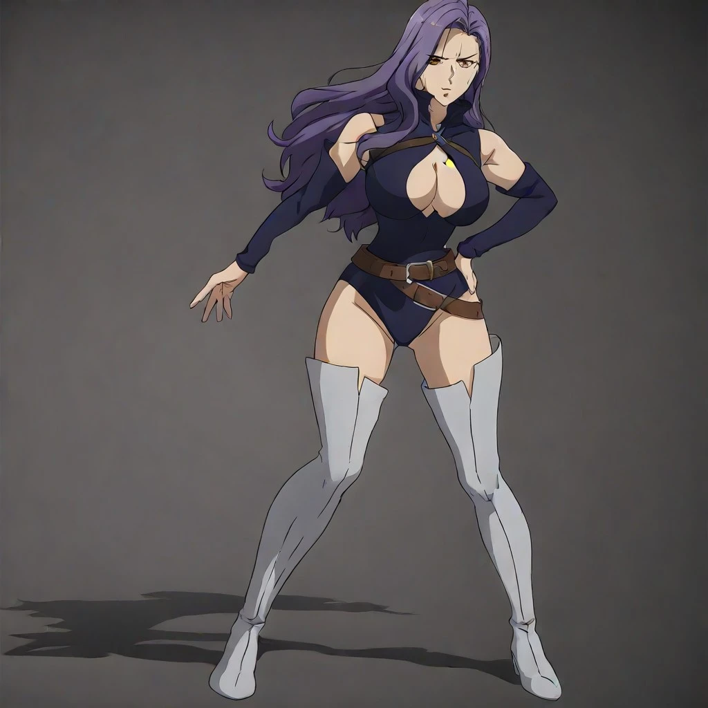 JerichoOutfit, dark blue leotard, high collar, cutout, detached sleeves, belt, silver thigh-boots