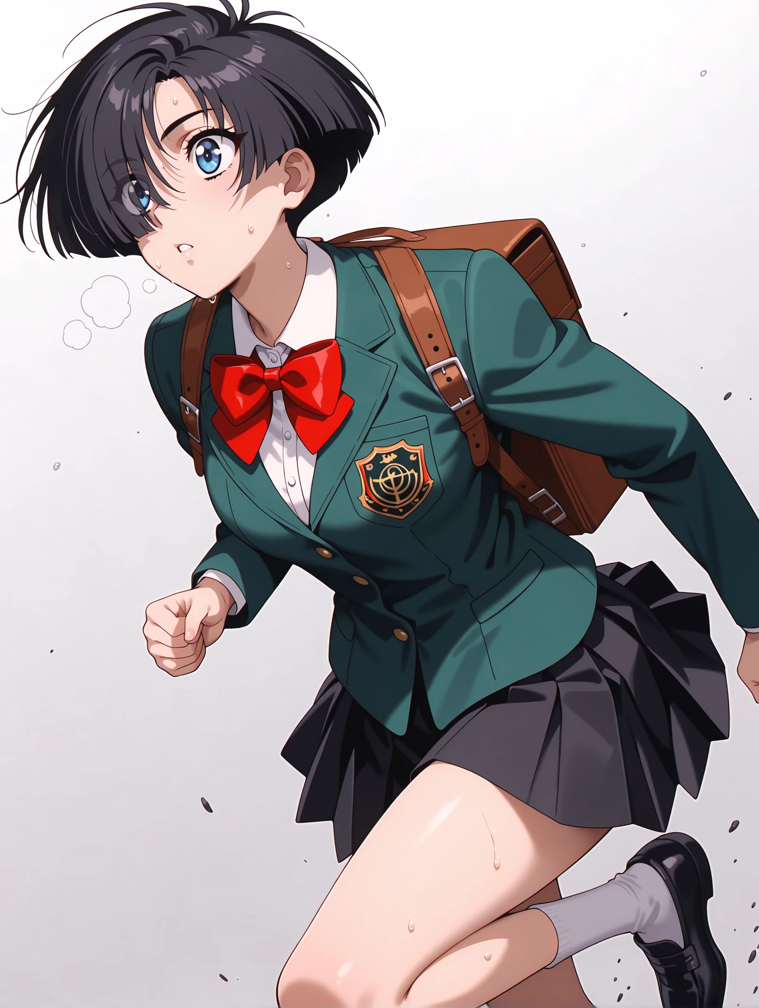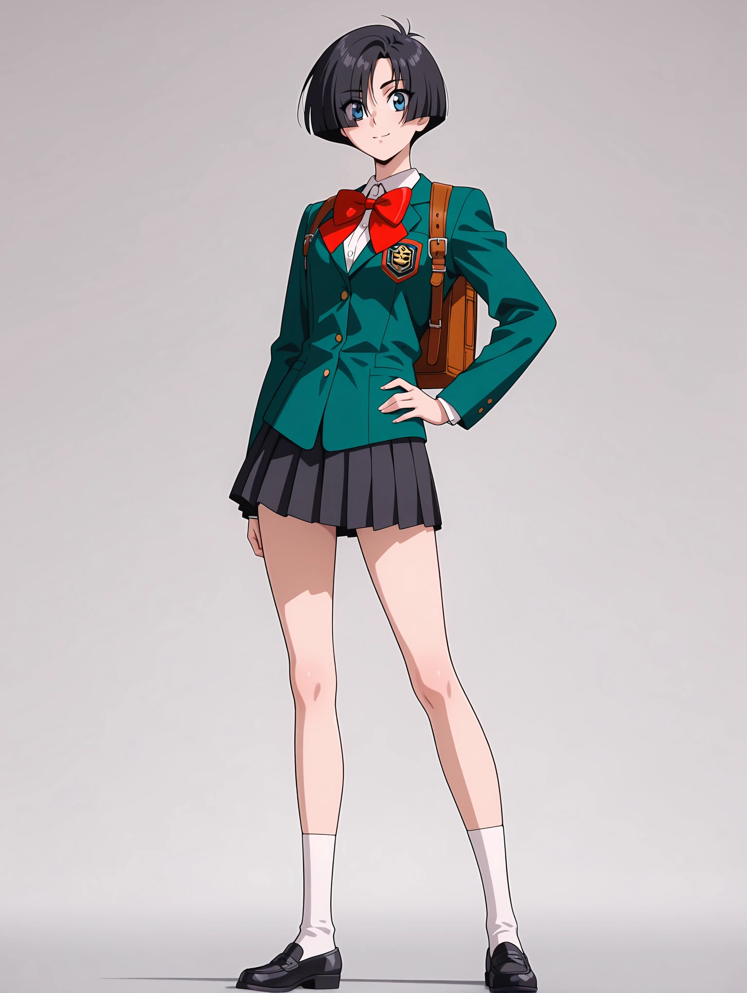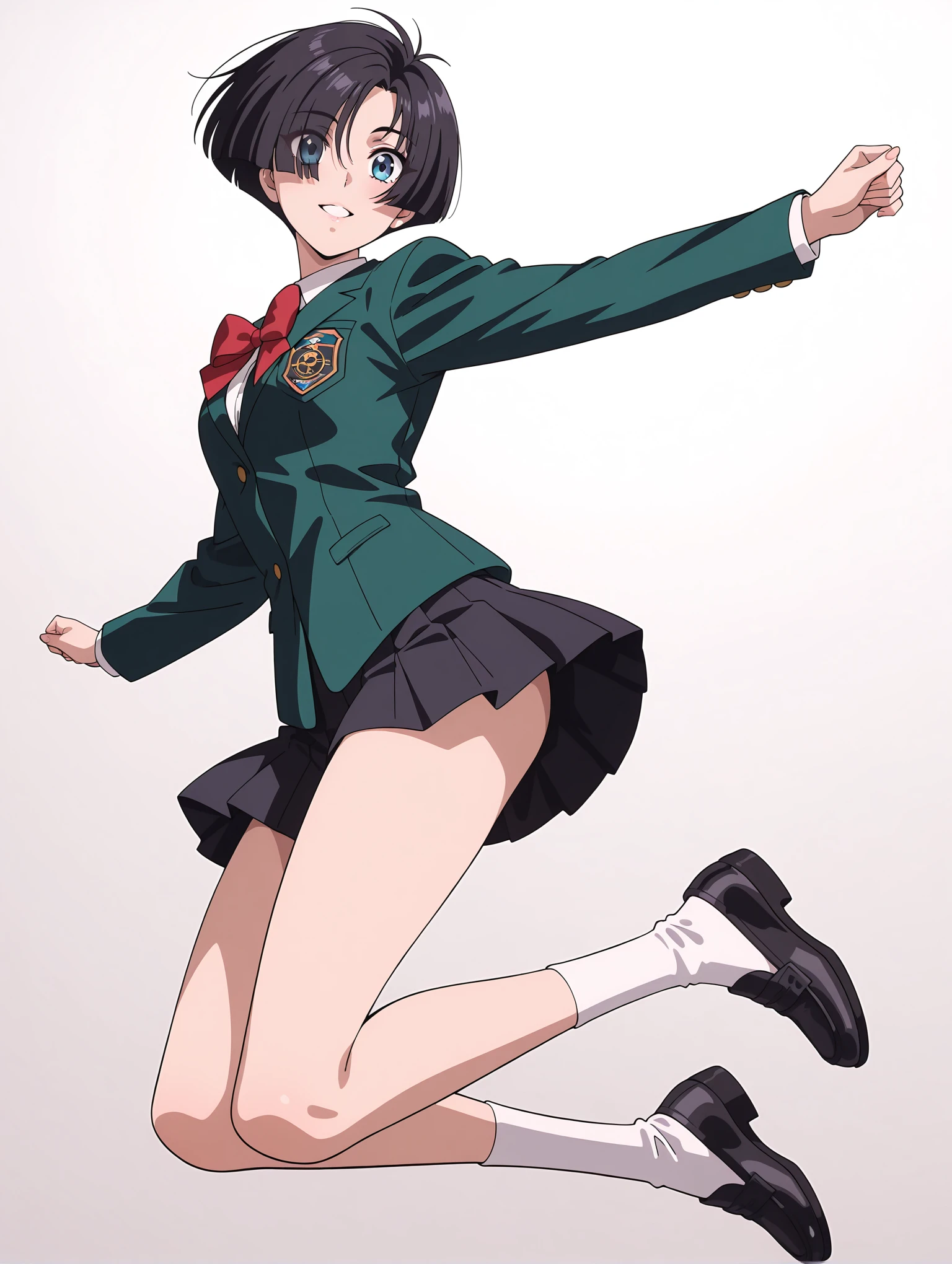 y_clothes,collared_shirt,red bowtie,green blazer,black pleated skirt,white socks,black footwear,