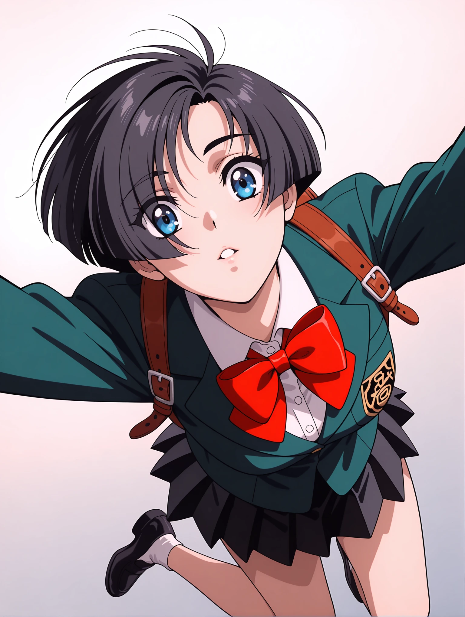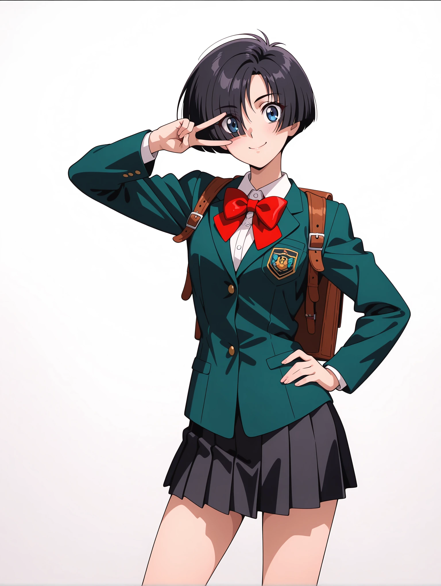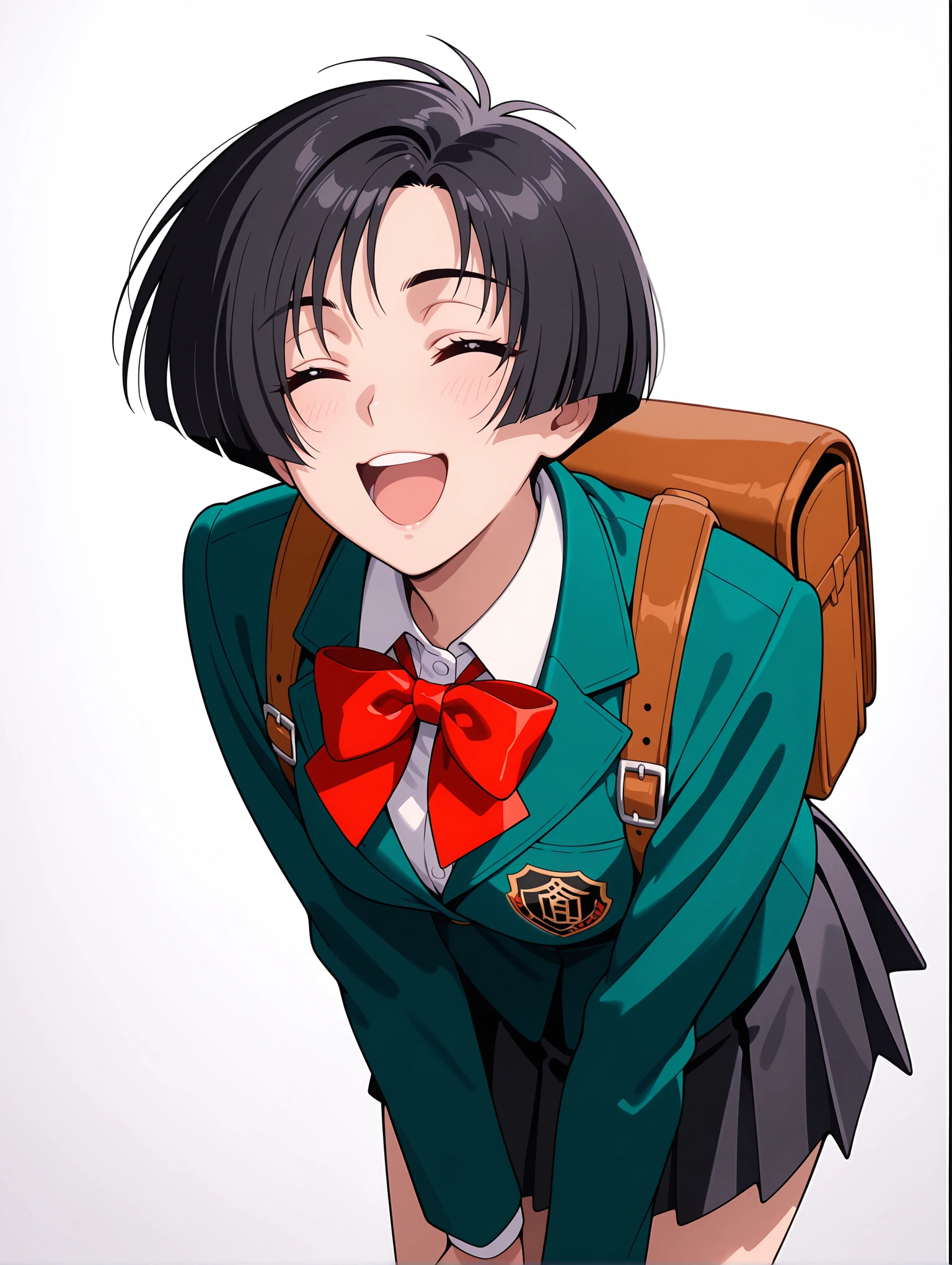 y_clothes,collared_shirt,red bowtie,green blazer,black pleated skirt,white socks,black footwear,