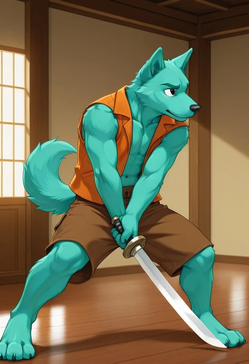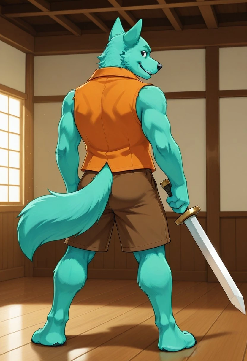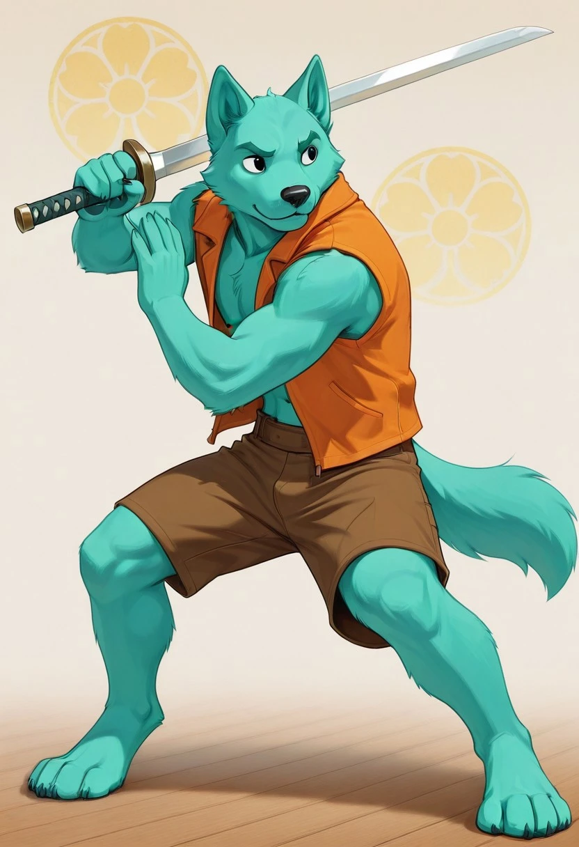 Aleksandr, Anthro, furry,dog, male,solo,Turquoise green fur,black eyes, turquoise green eyebrows,tail,open sleeveless orange jacket,Shirtless, Brown shorts