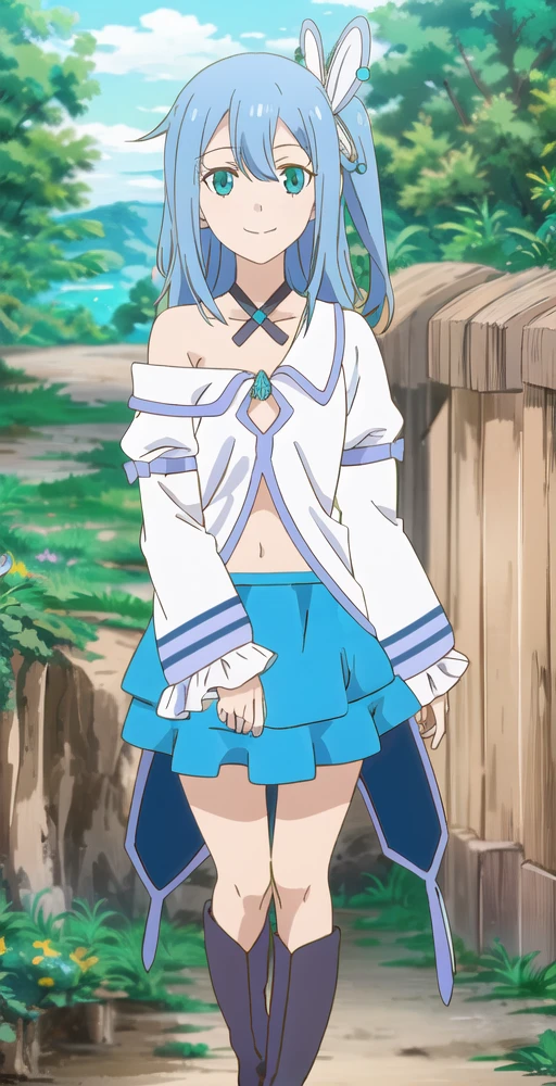 Main outfit-'hair ornament, side ponytail, neck ornament, off shoulder tailcoat, miniskirt, boots,'