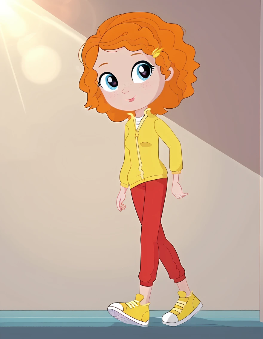 suepatterson, vector illustration, big head, clearly defined lines, thick outlines, clean style, pale skin, little freckles over nose, light blue iris with white radial concentric lines, curly orange hair, large round eyes, yellow jacket, red pants with number 5, blue and yellow sneakers,