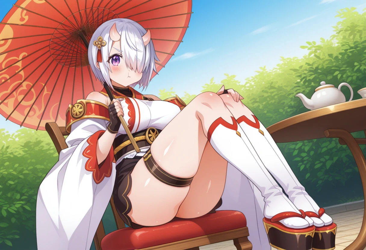 Oni Komichi, oni horns, 1girl, solo, short hair, white hair, hair over one eye, hair ornament, purple eyes, large breasts